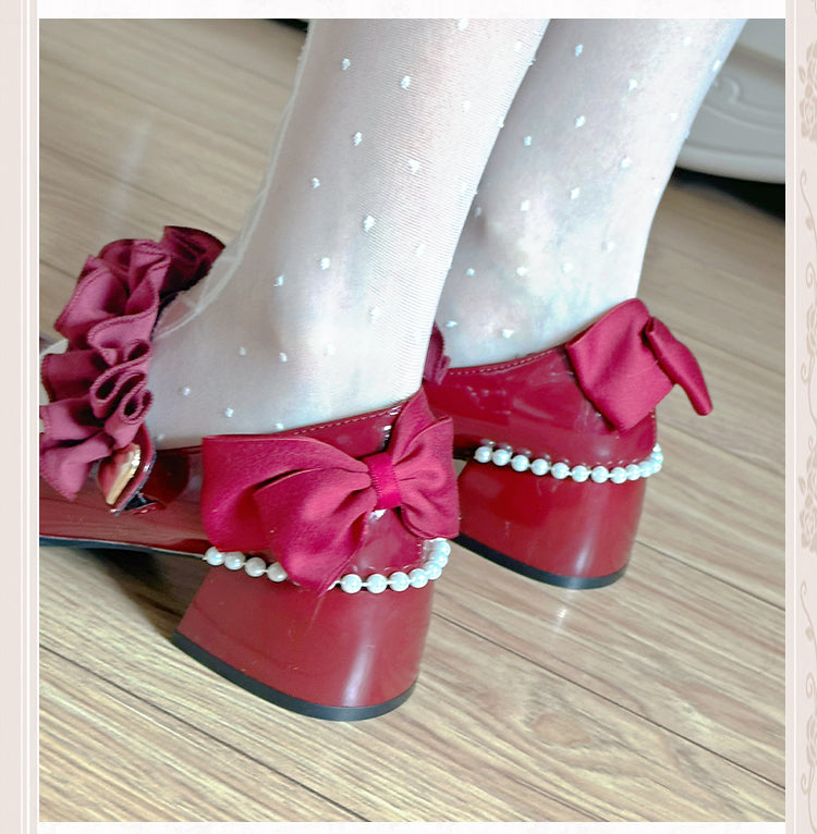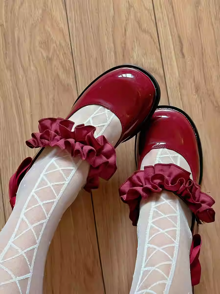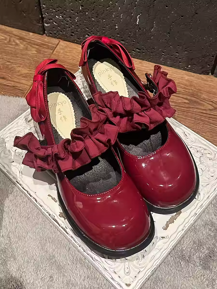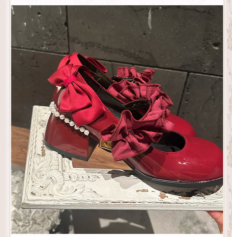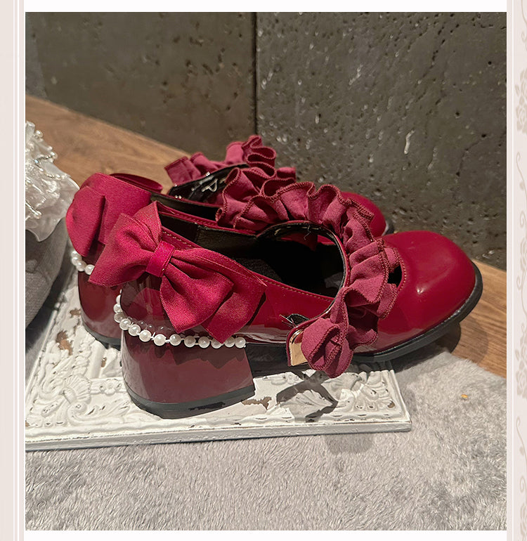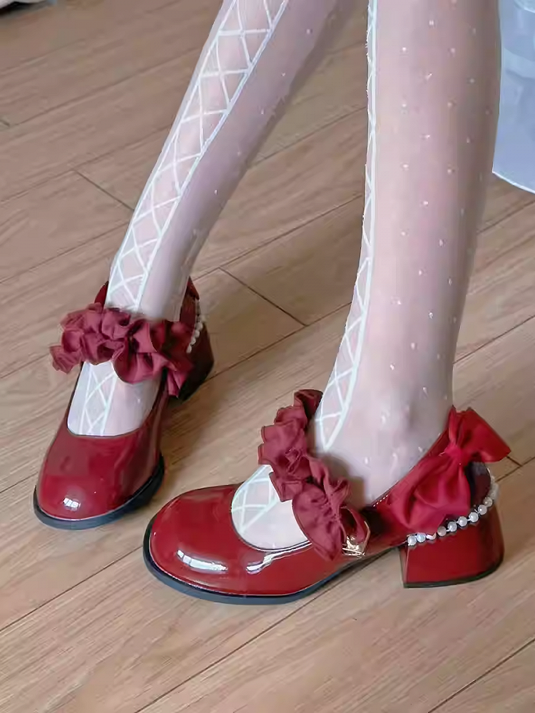 Diese eleganten, weinroten Mary Janes bestechen durch ihre charmante runde Zehenpartie, den zarten Rüschenbesatz und den stylischen Blockabsatz. Die Perlenkette verleiht jedem Outfit einen Hauch von Klasse. Perfekt, um jedem Look eine süße und stylische Note zu verleihen.
