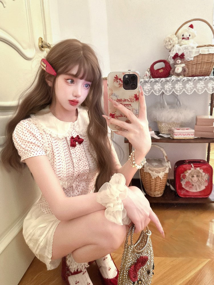 Weiße Dollcore-Baumwollbluse mit roten Tupfenakzenten