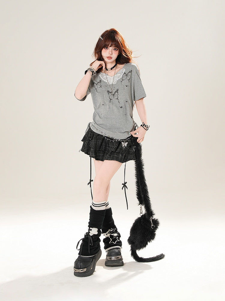 Grey T-Shirt with Butterfly Print, Butterfly Lace-Embellished Neckline & Drawstring Waist