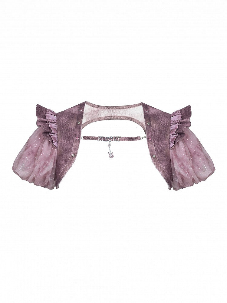 Puff Glitter Rhinestone Denim Punk Y2K Sleeves Pastel Lettering Pink Shrug Detachable with
