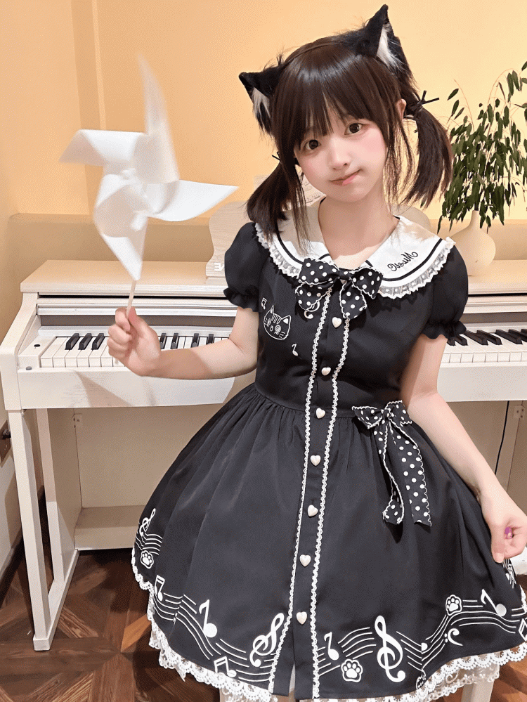 Puff Melodic Kitty Schwarz Matrosenkragen Keyboard Kleid Design Rückenärmel Kurz