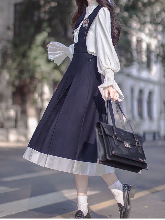 Blau-weißes Old School Lolita Fashion Kleid mit Schleife und Details, JSK-Set