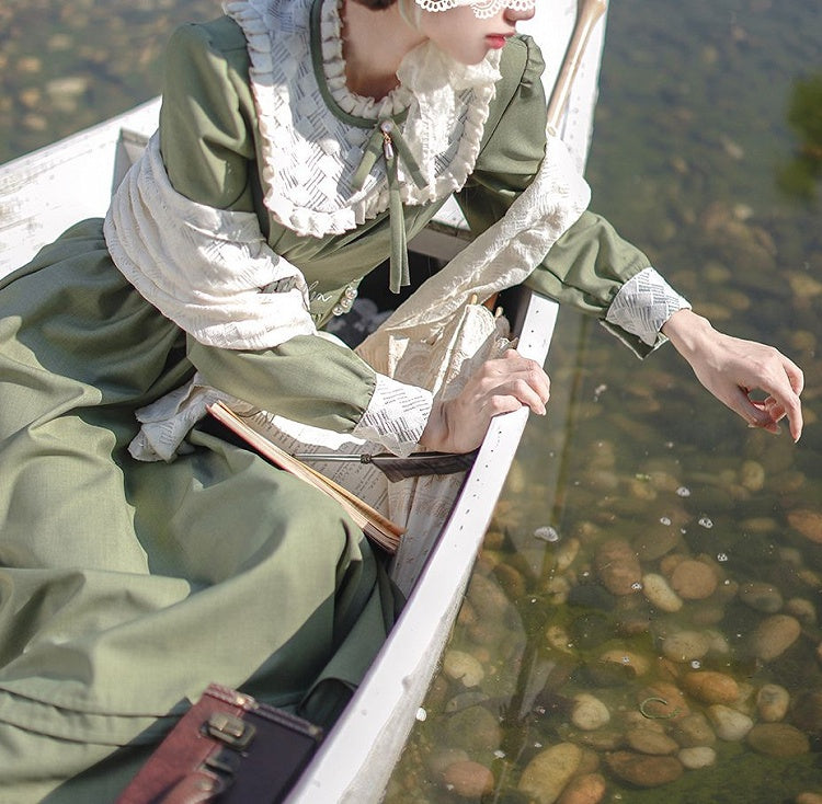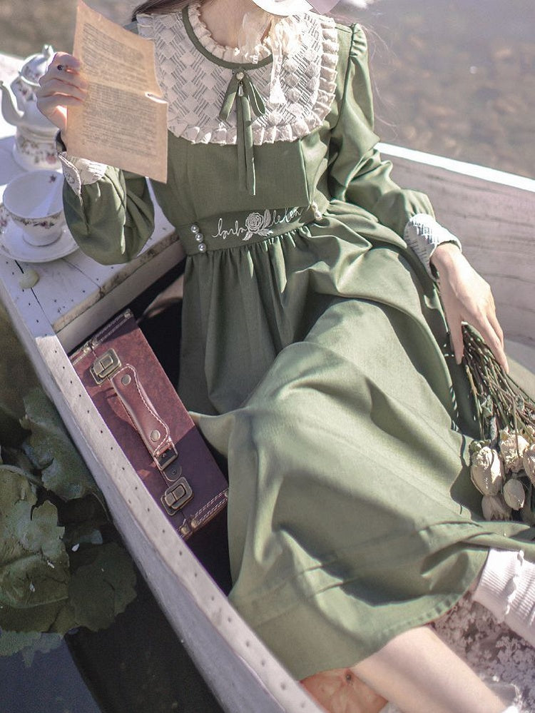 Matcha-grünes Vintage-Kleid mit Blumenstickerei und Rüschenausschnitt