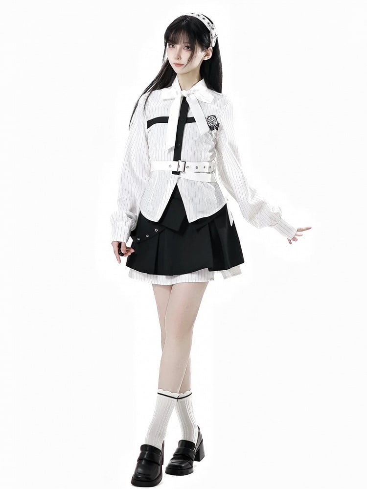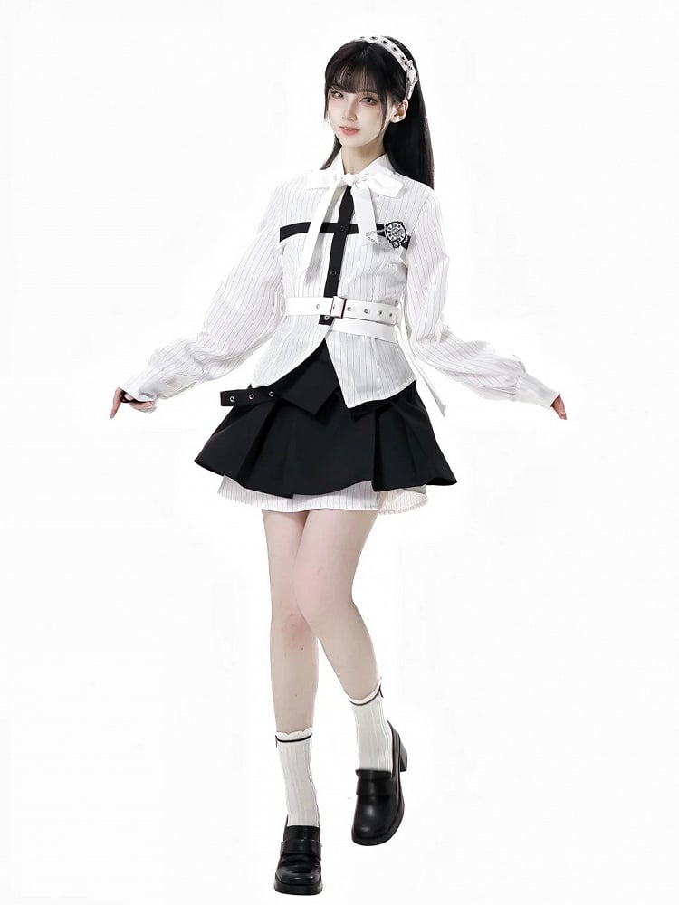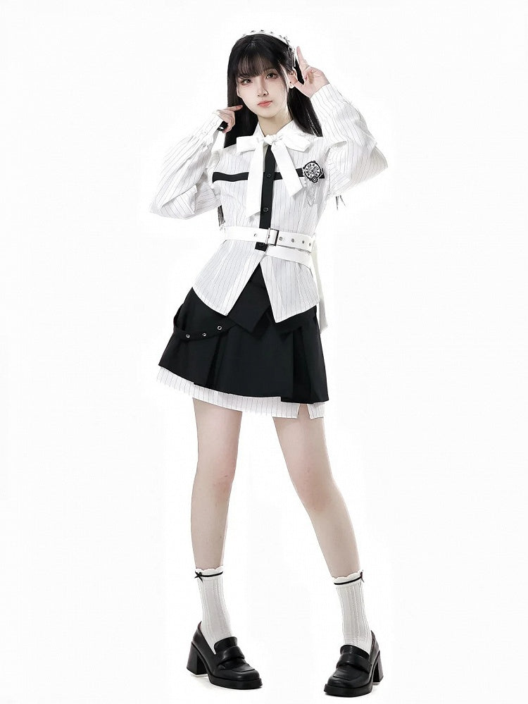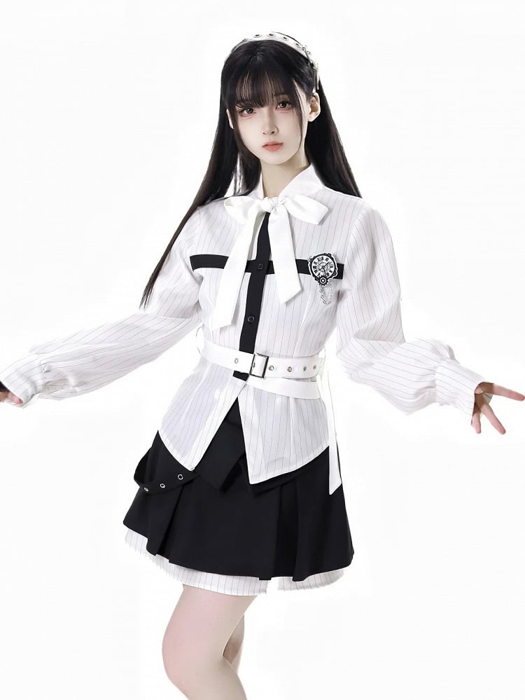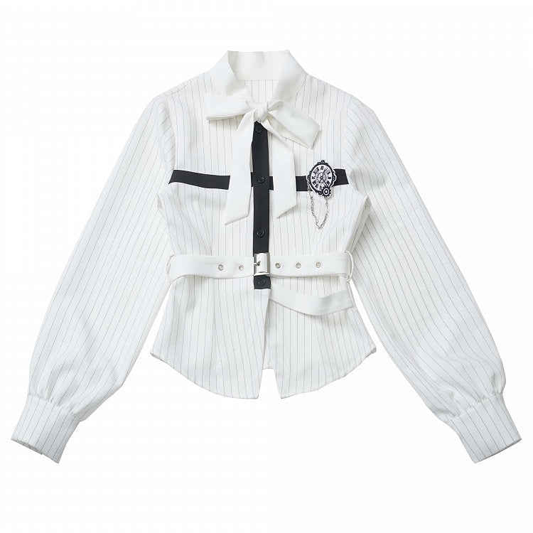 Hemd mit schwarzer Schleife und weißen Streifen zum Selbstbinden, Kreuzdesign und abnehmbarer Schmetterlingsuhr-Brosche