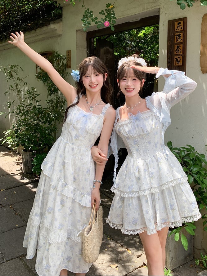 Hellblauer Stufenrock mit Spitzenbesatz, kurze Version, geblümtes Camisole-Kleid mit Schnürung am Rücken