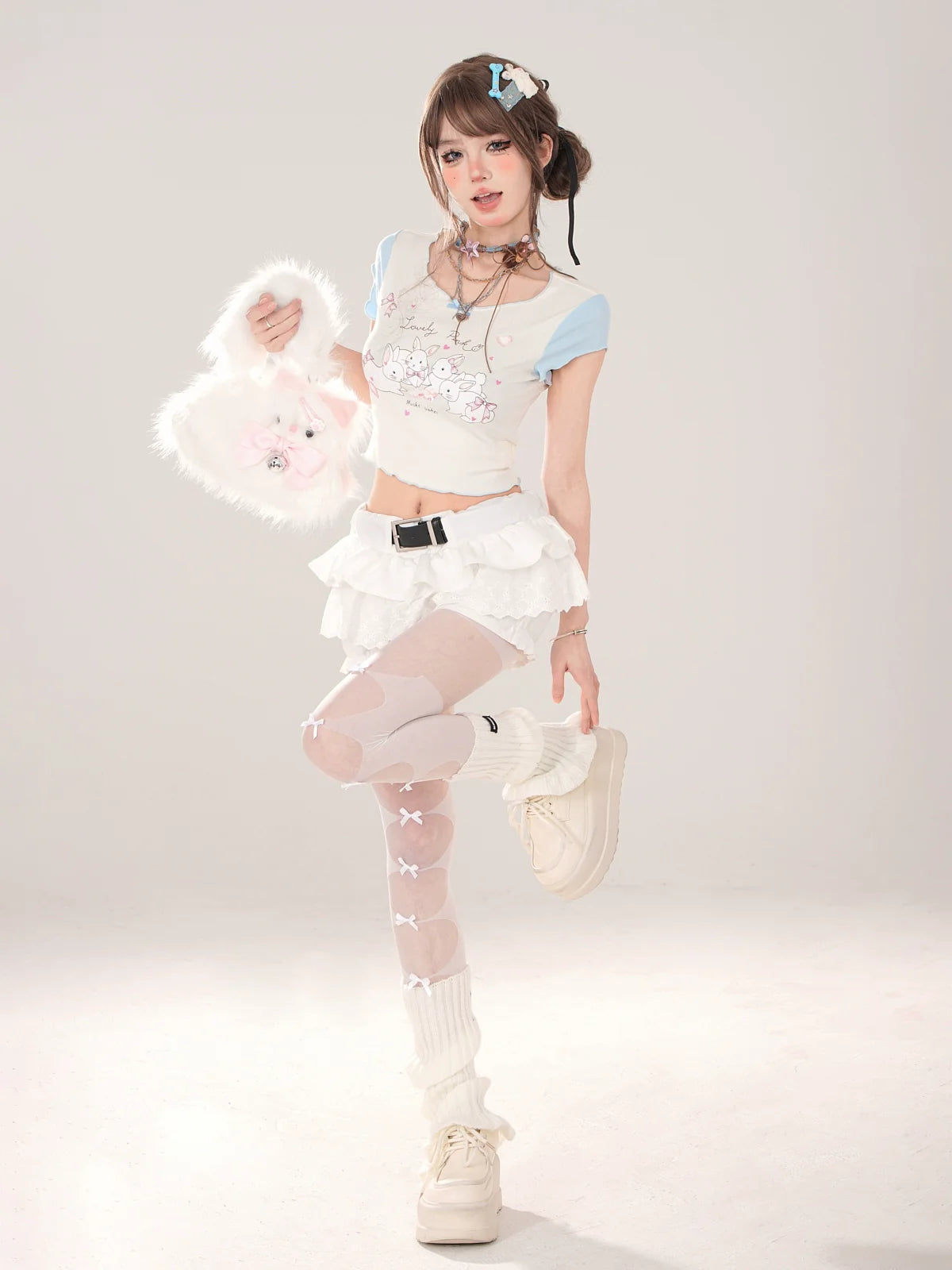 Dieses bezaubernde kurze T-Shirt hat ein süßes U-Ausschnitt-Design mit einem verspielten Rüschenmuster mit Kaninchen. Perfekt, um jedem Outfit einen Hauch von Niedlichkeit zu verleihen.