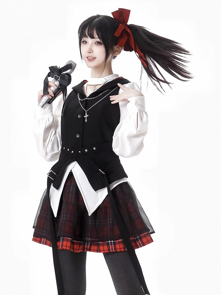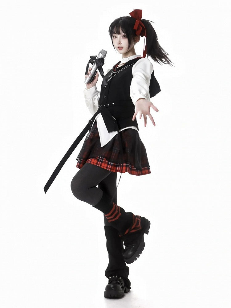 Rock mit Schnalle Mesh Overlay Rot Plaid Muster Gürtel Hexagramm Stickerei Idol