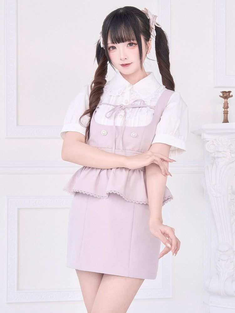 Weiße kurzärmelige Jirai Kei-Bluse mit abnehmbarer Schleifenbrosche und Spitzenbesatz
