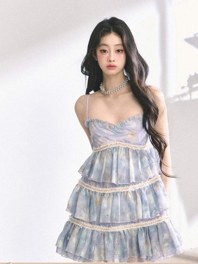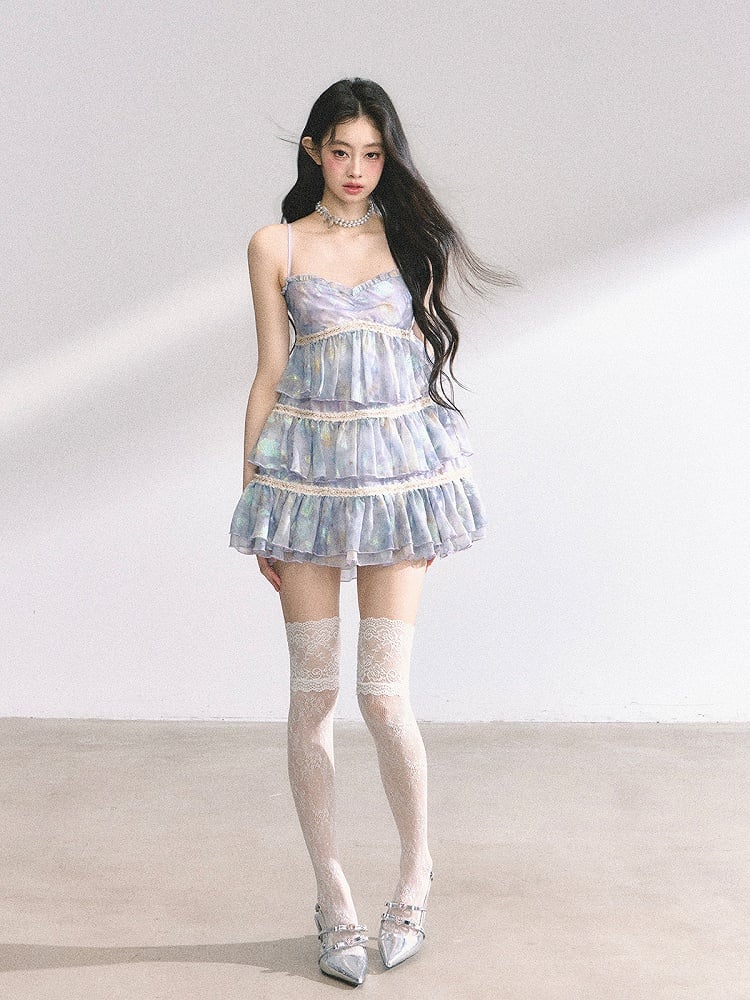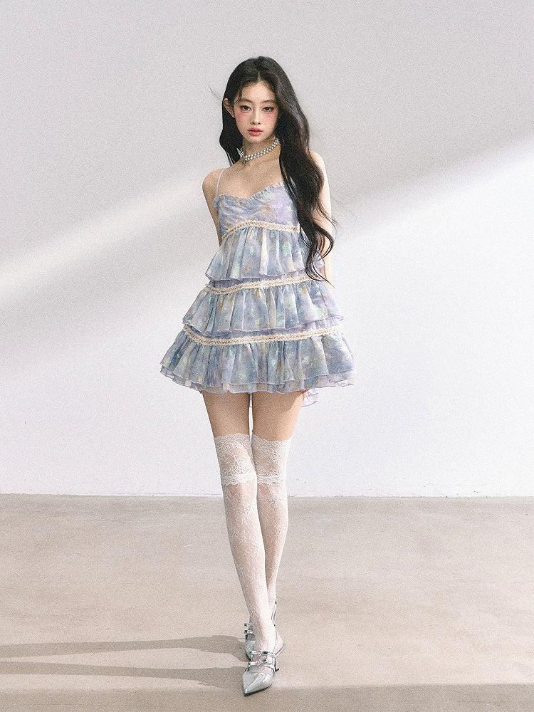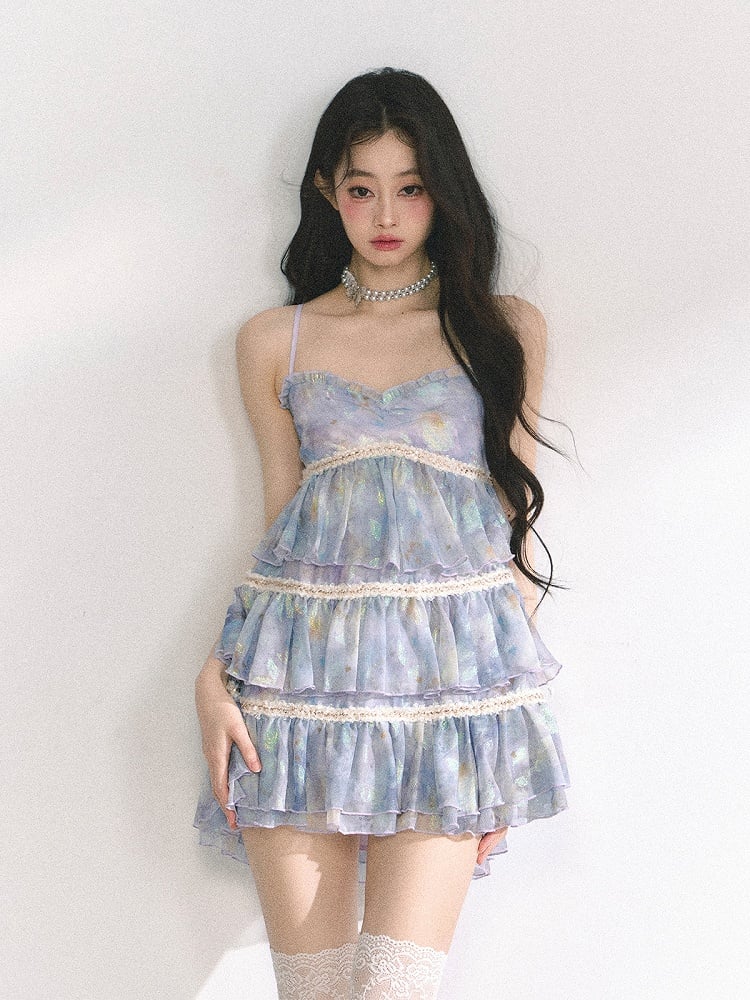 Slip Kleid Tiered Ausschnitt Rock Blau Sweetheart Ölgemälde Floral Mini