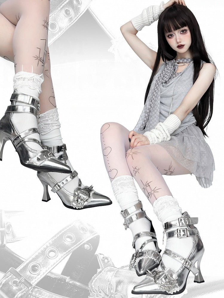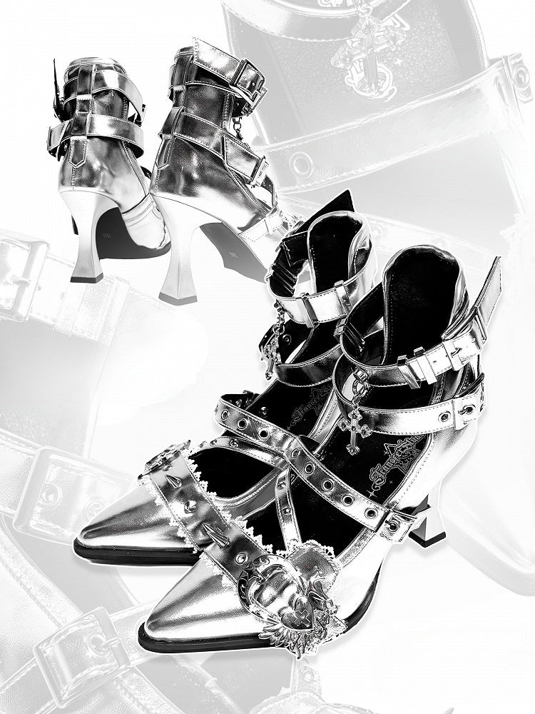 Spitz zulaufend, hoch, Herz, Gothic – silberner Absatz, Kegelschnalle