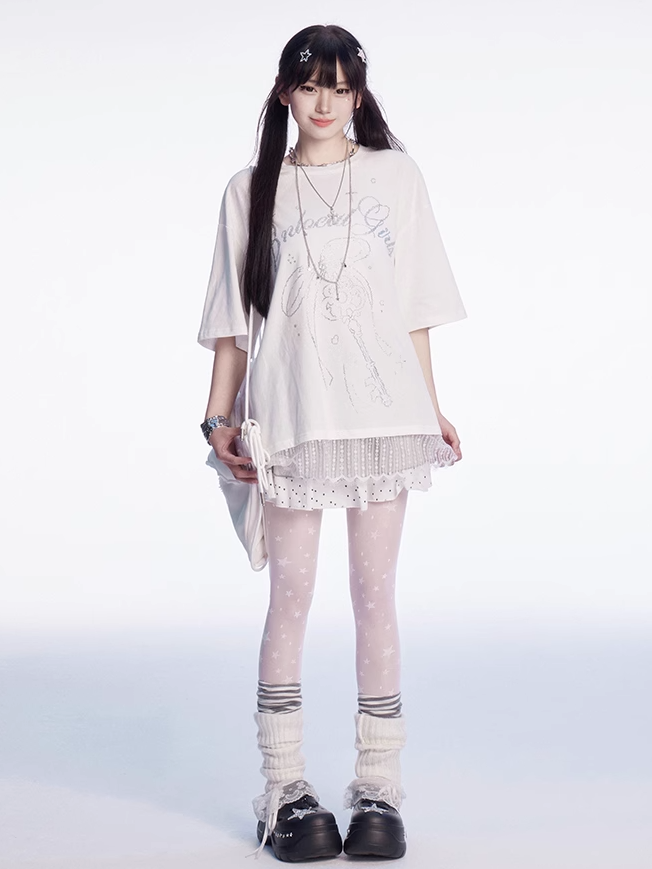 Weißes T-Shirt mit Rundhalsausschnitt, Schleife und Strasssteinen, Spitzenbesatz