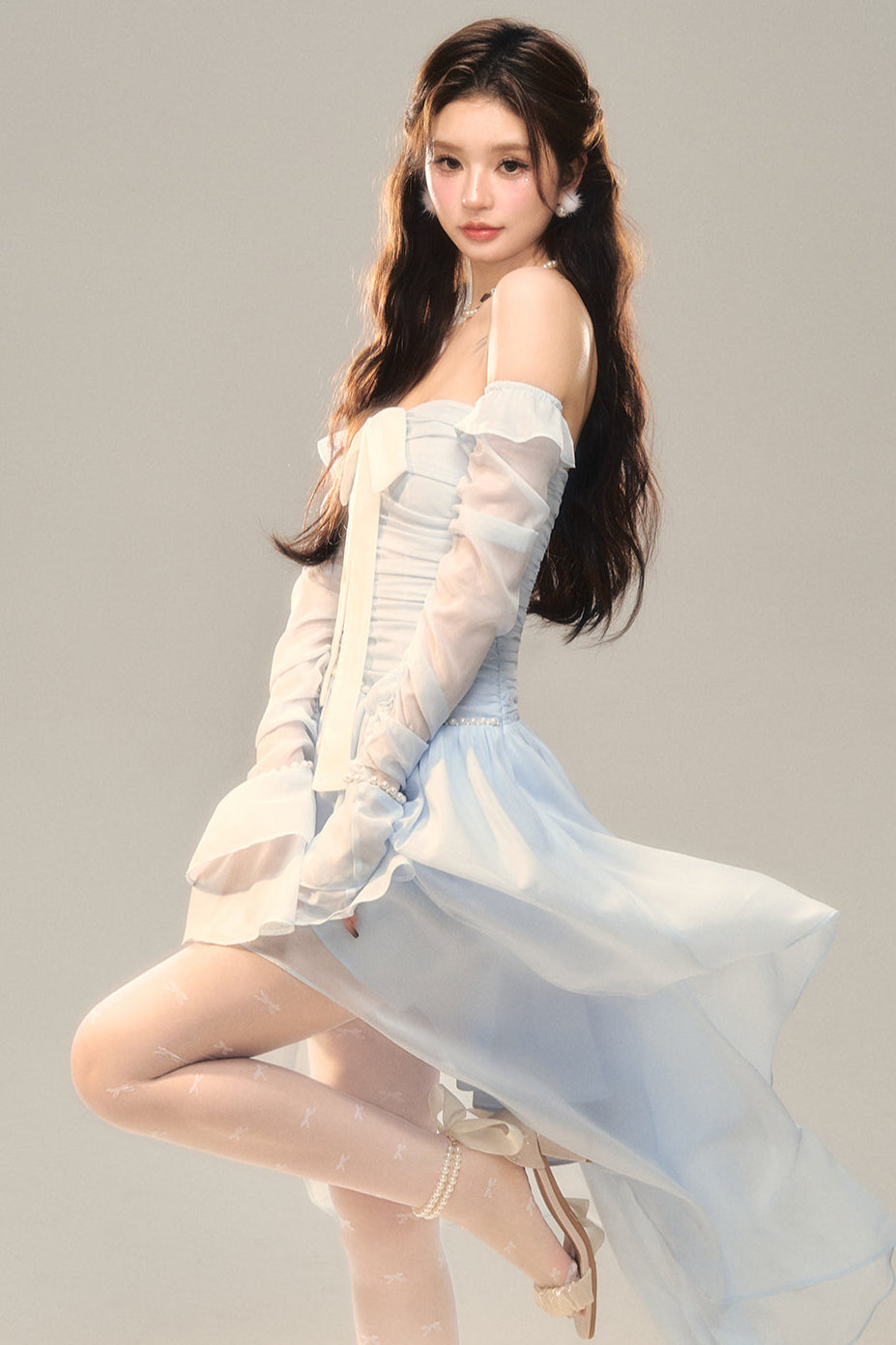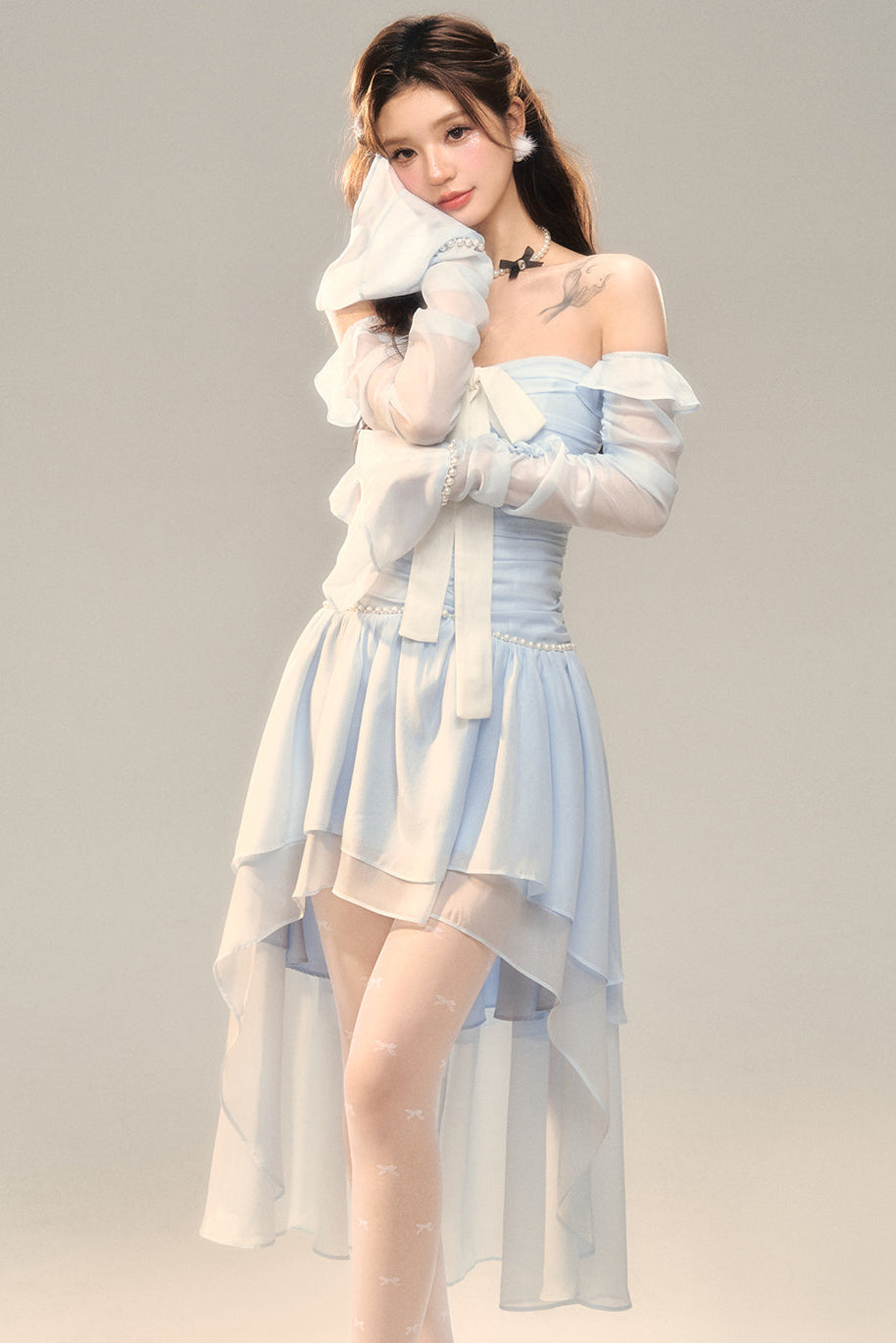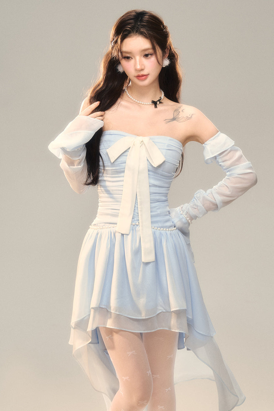 Blau-weißes Old School Lolita Fashion Kleid mit Schleife und Details, JSK-Set