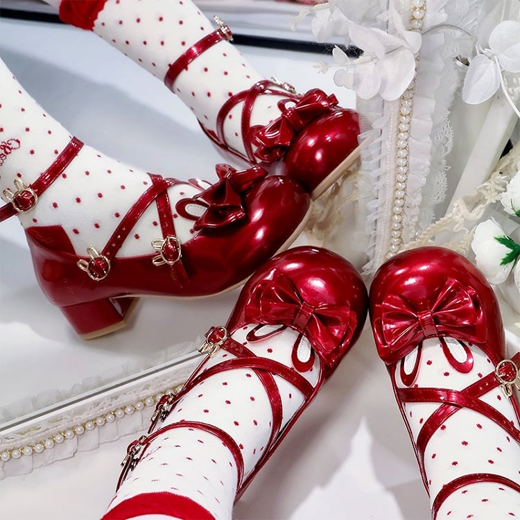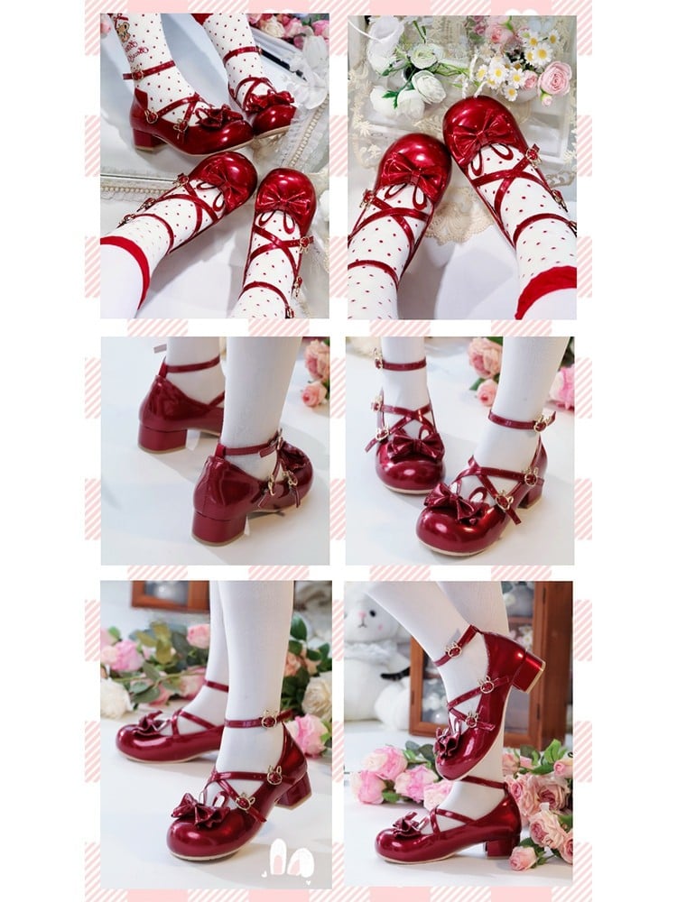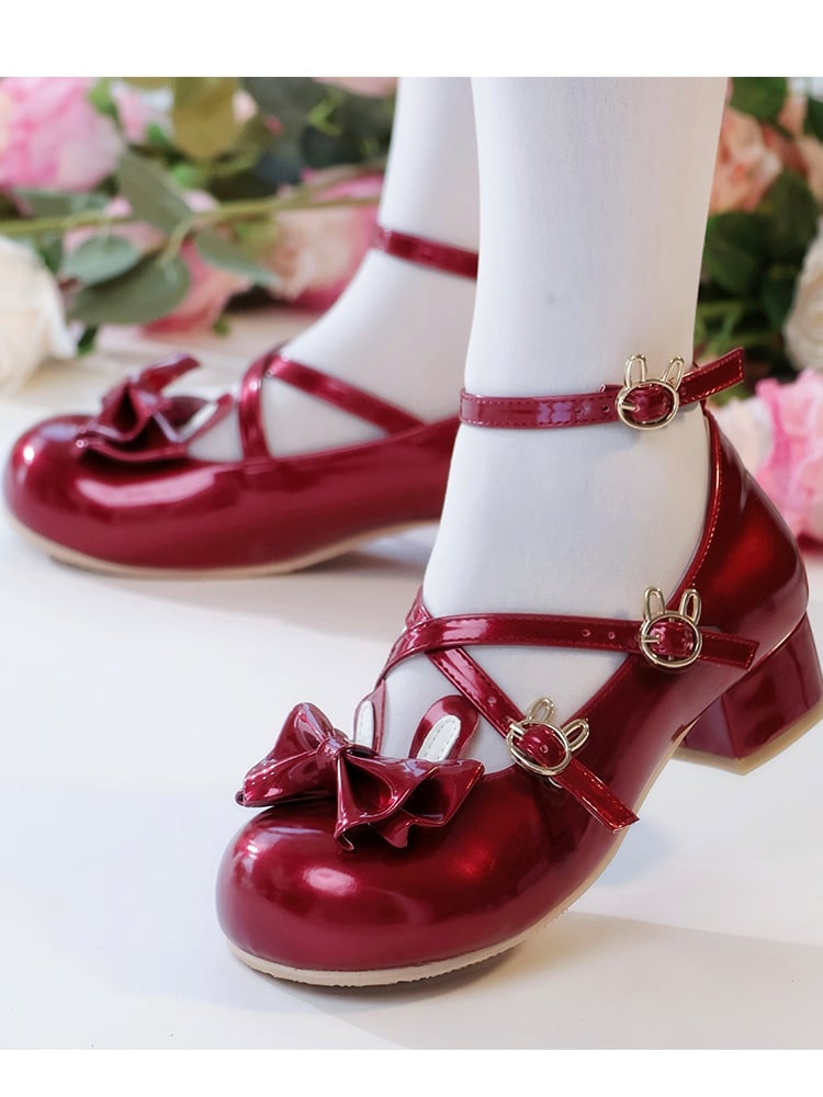 Bow at Top, Rabbit Ears & Crisscross Buckle Details Round Toe Sweet Lolita Wine Red Low Heels in PU Leather