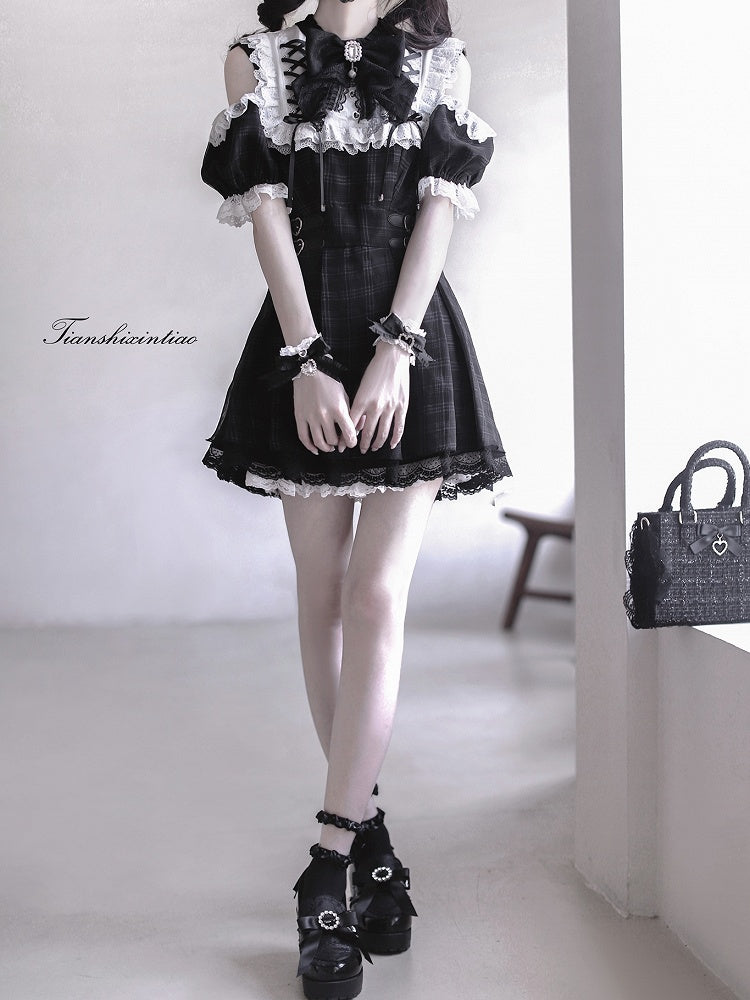 Trim Jirai Muster offen im Kleid Kei Plaid Spitze weiße Schulter mit Schnürung schwarzen Ausschnitt