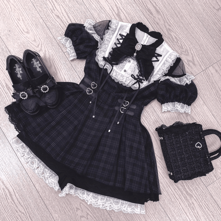 Jirai Kei – Schulterfreies Kleid mit schwarzem Karomuster, Schnürausschnitt und weißem Spitzenbesatz