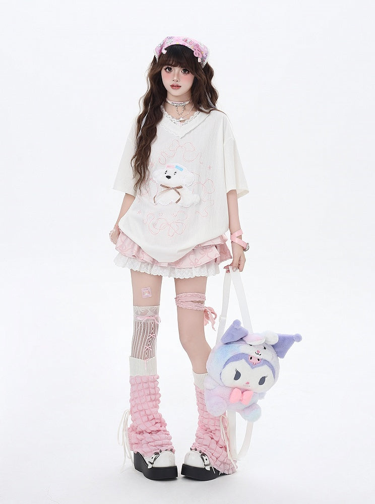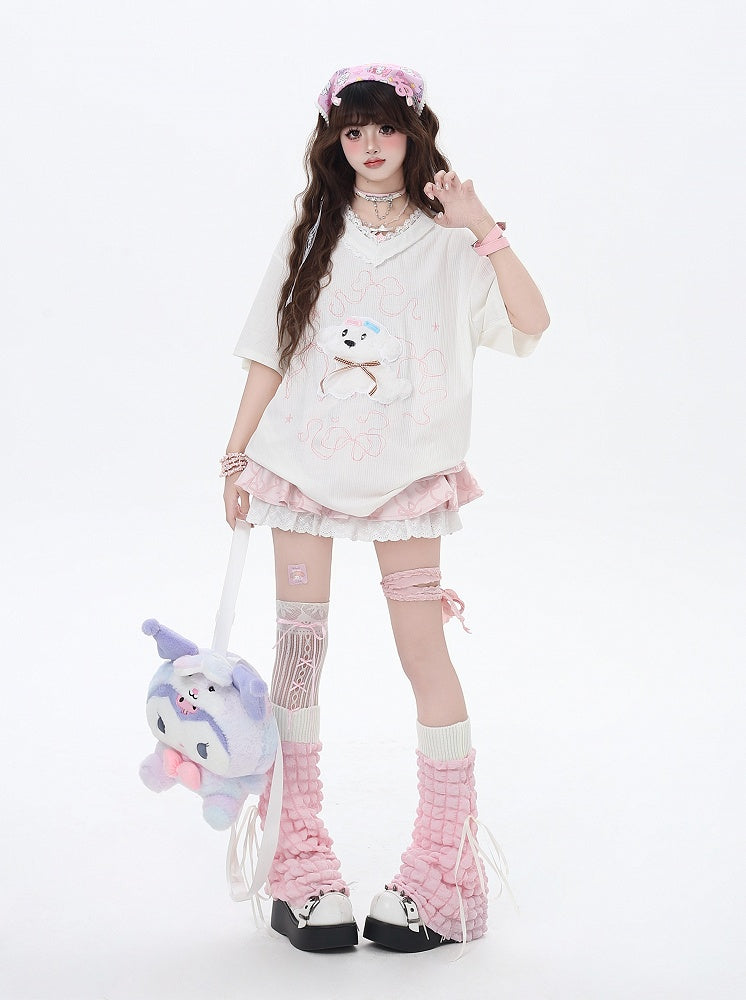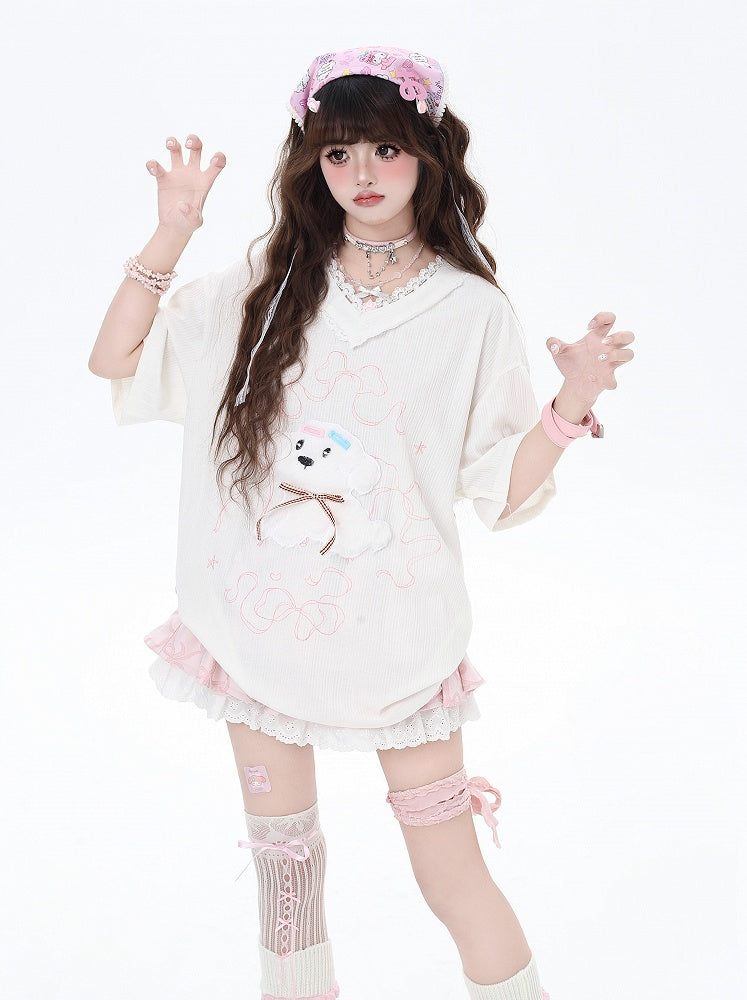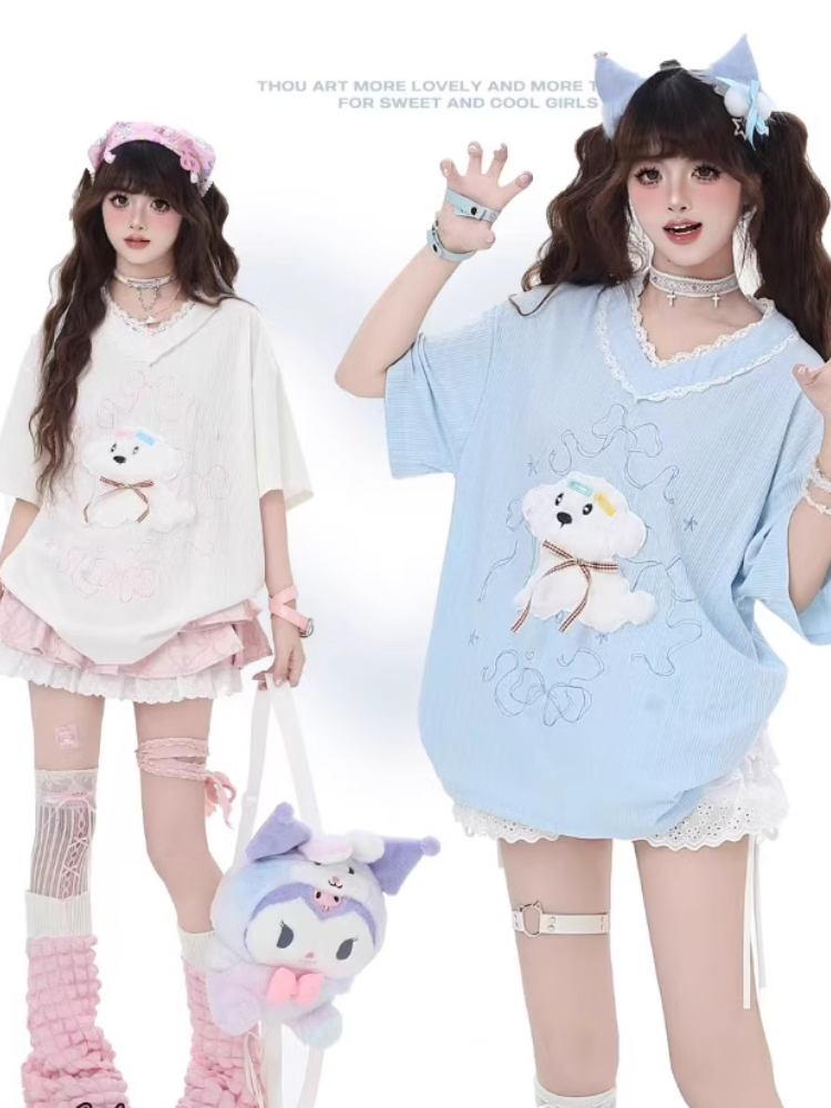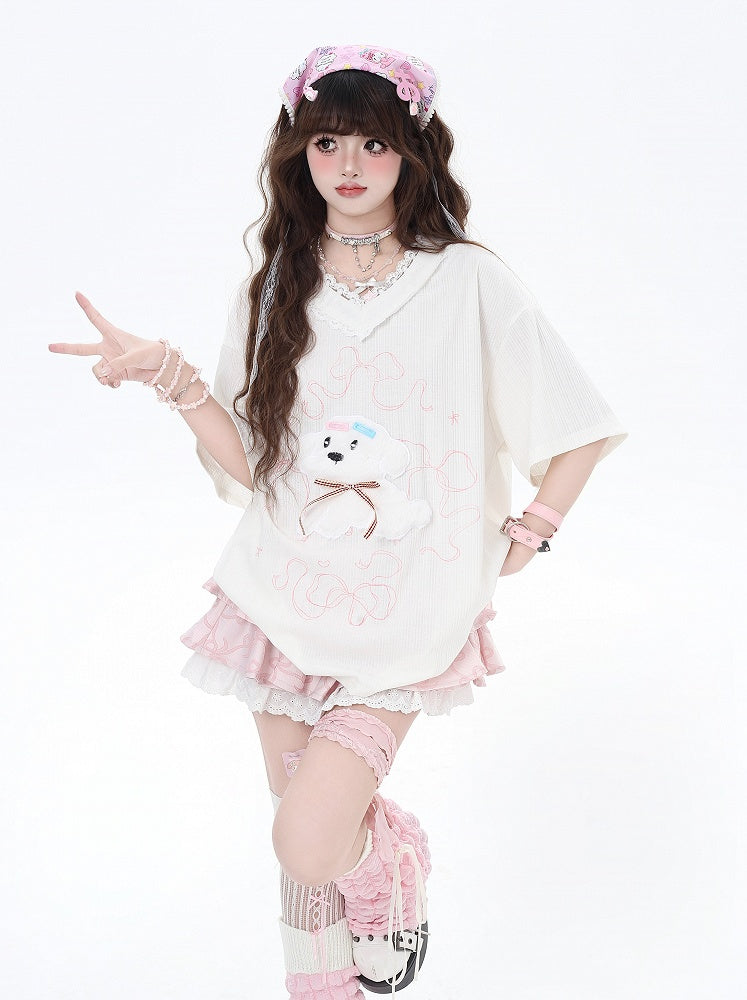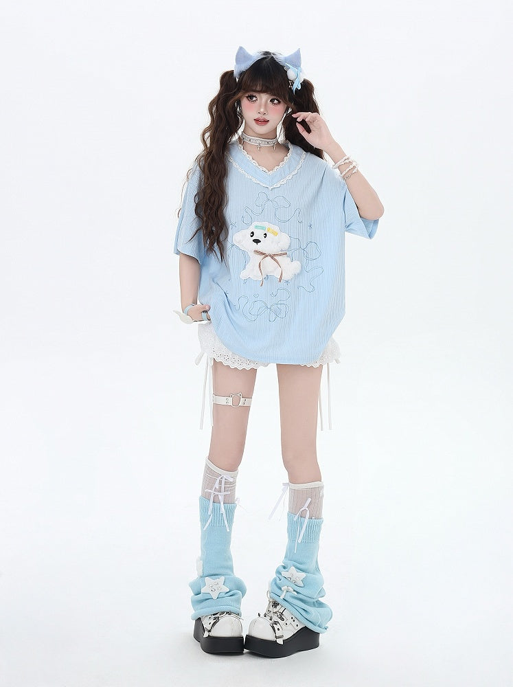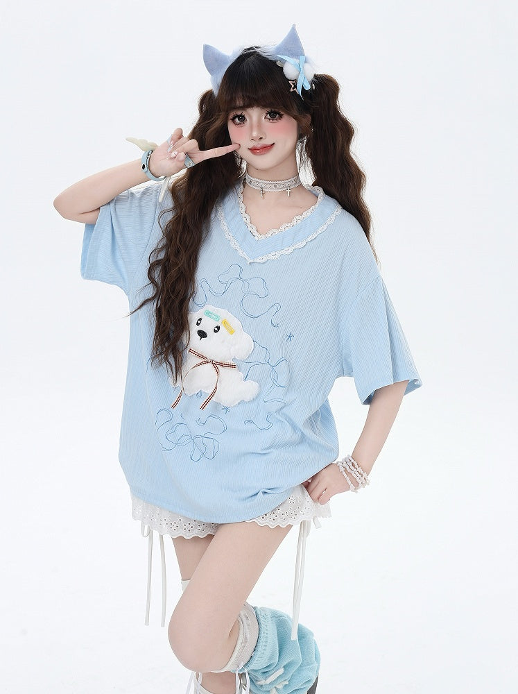 Beige/Hellblaues, lockeres T-Shirt mit V-Ausschnitt und Spitzenbesatz und Welpen-Applikation
