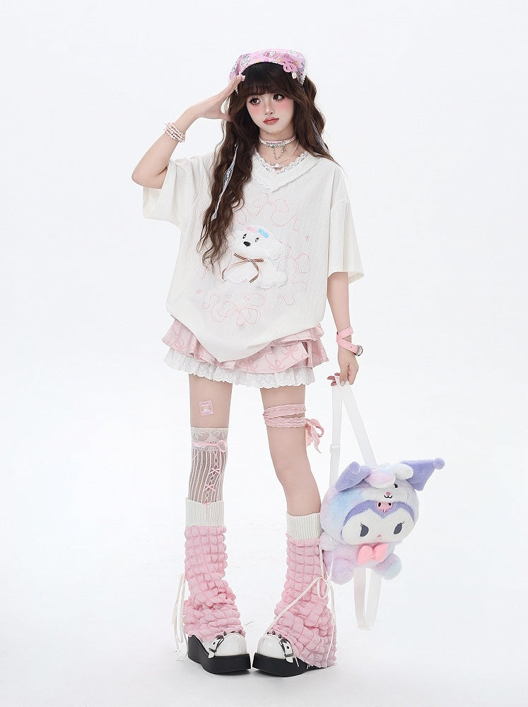 Lockeres T-Shirt mit V-Ausschnitt und Plüsch-Welpen-Applikation in Beige/Hellblau