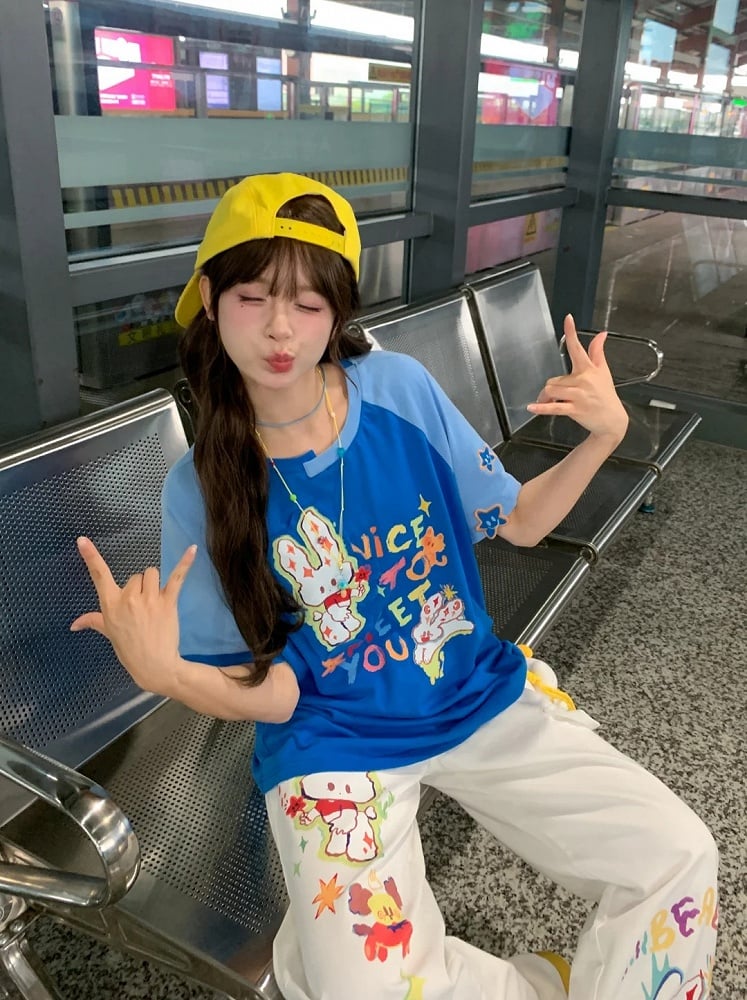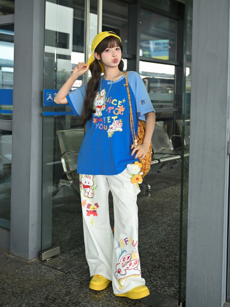 Weiße Jeans mit weitem Bein und niedriger Taille und Cartoon-Häschen-Print