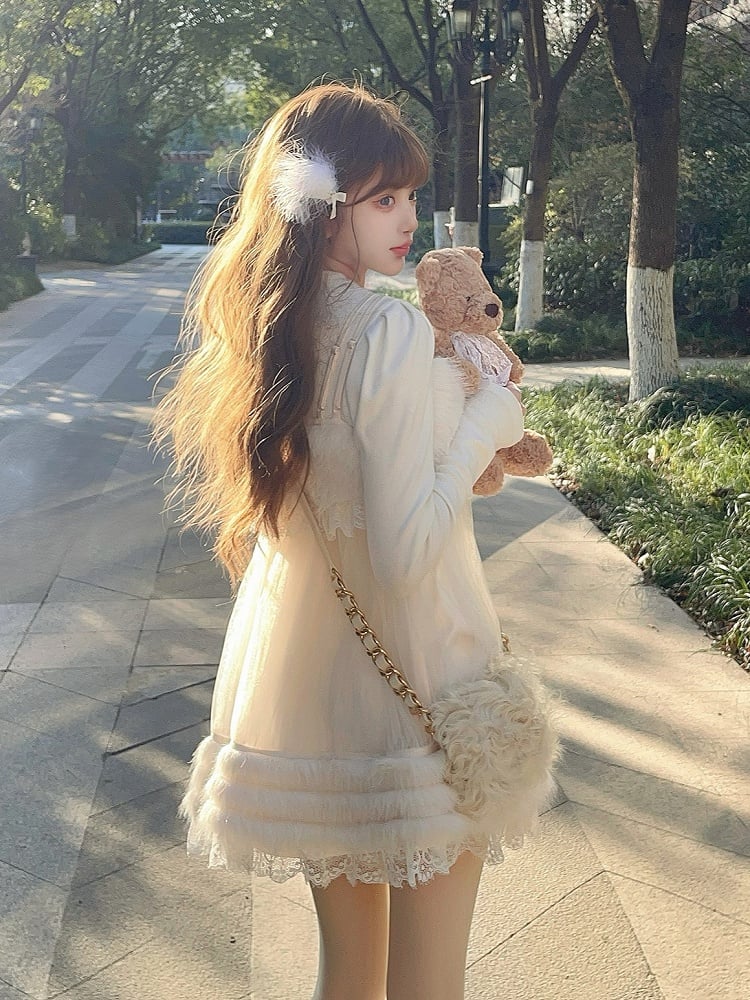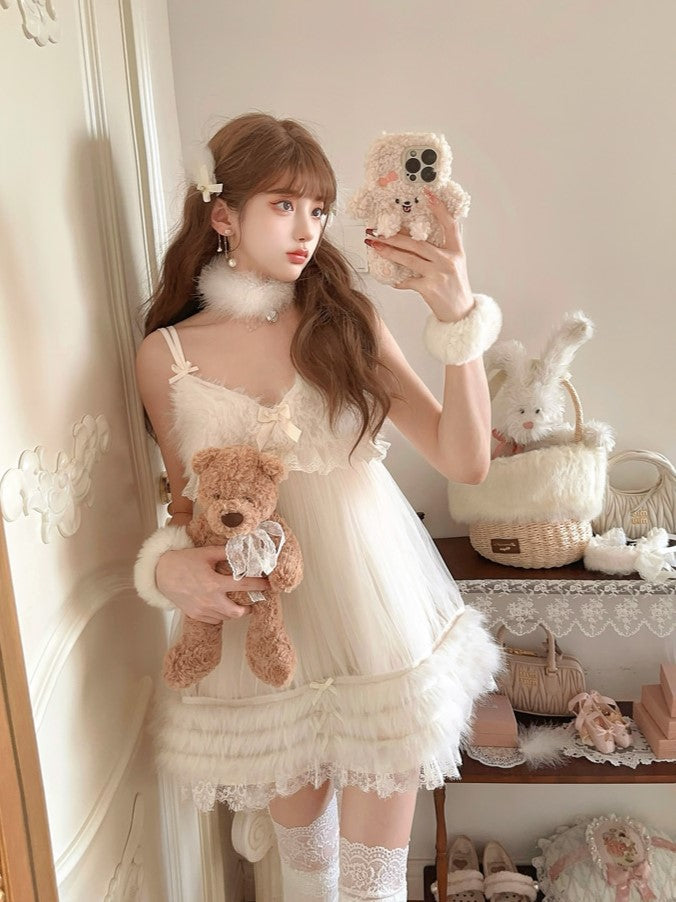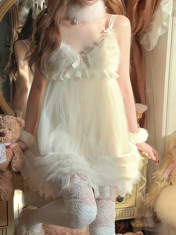 Weiße Kunstpelzakzente mit Slip-Tüllkleid