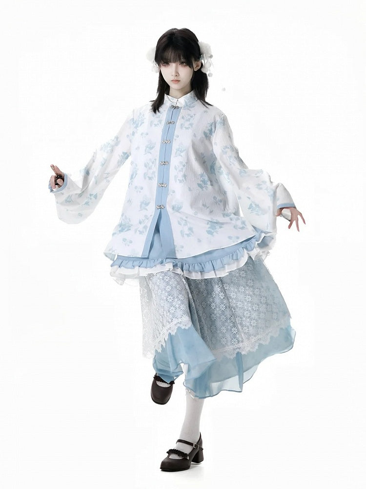 Weißes Blumenmuster, gebänderter Kragen, Knotenknöpfe, Rokoko-Blau, Cheongsam-Bluse