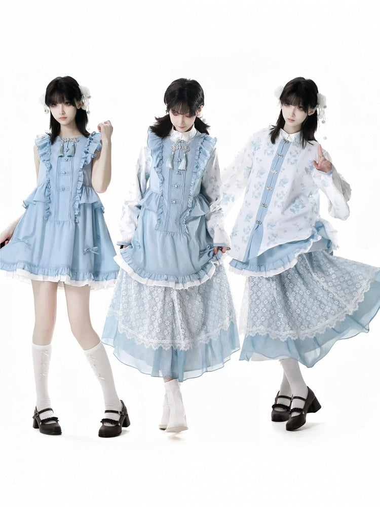 Blau-weißes Old School Lolita Fashion Kleid mit Schleife und Details, JSK-Set