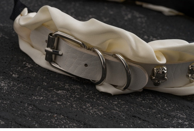 Veredeln Sie Ihren Stil mit dieser bezaubernden weißen Gothic-Skelett-Nietenschnalle mit Rüschen-KC. Die weiße Farbe verleiht einen femininen Touch, während die Skelett-Nieten dem Ganzen einen Hauch von Extravaganz verleihen. Die Rüschendetails verleihen ein verspieltes und süßes Element und machen das Accessoire zum perfekten Accessoire für jedes Outfit.