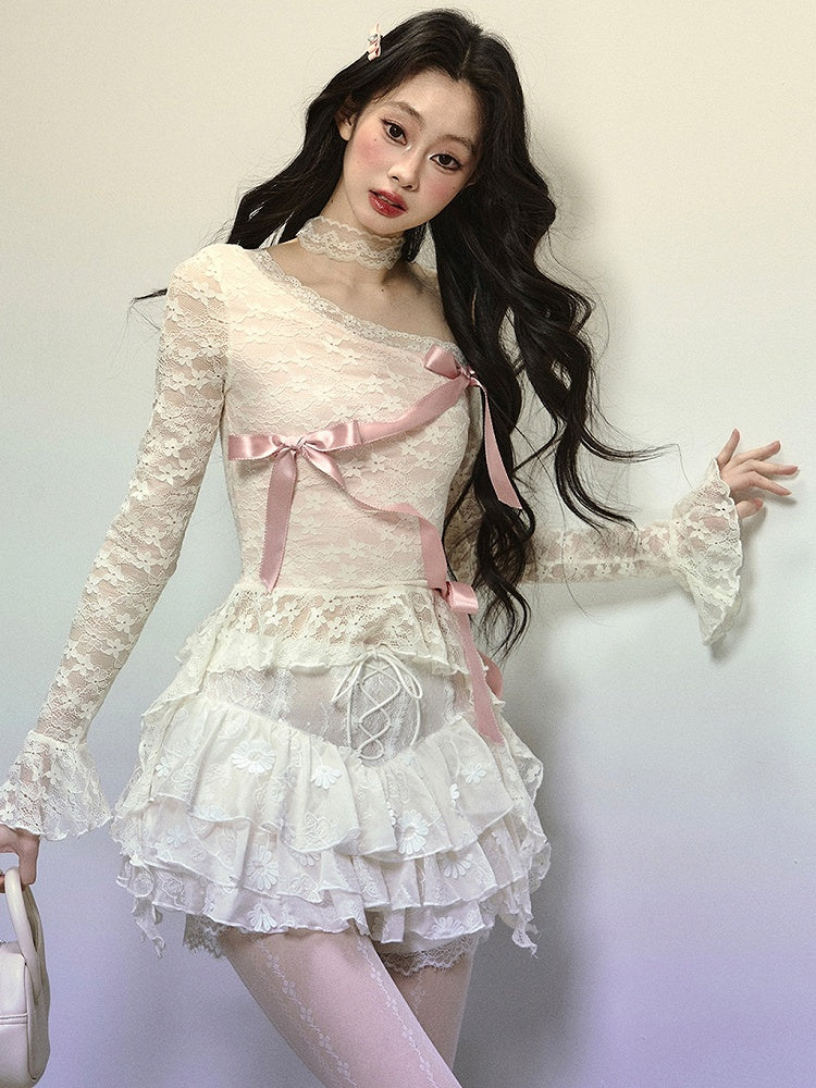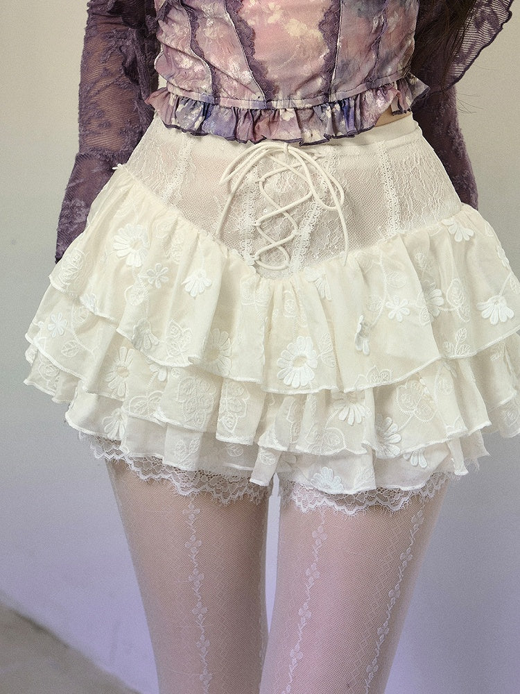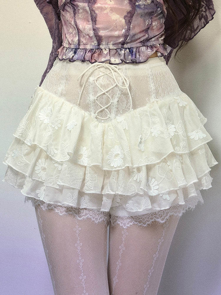 Weißer Spitzen-Minirock mit Blumenmuster und hoher Taille und Schnürdetail
