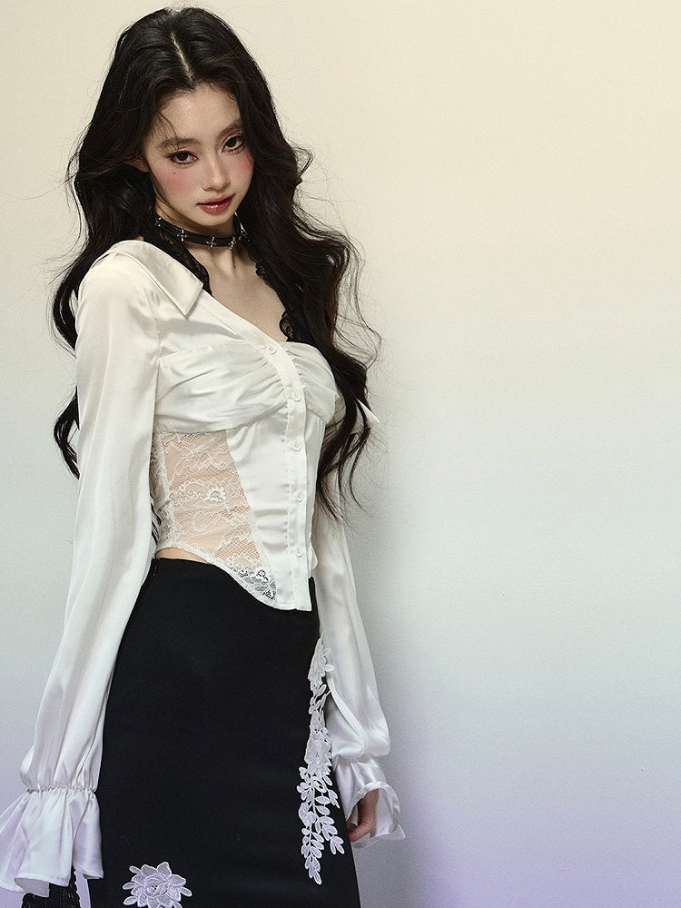Weiße Bluse mit Spitzenpatch an der Taille und langen Ärmeln mit Neckholder-Design aus schwarzer Spitze