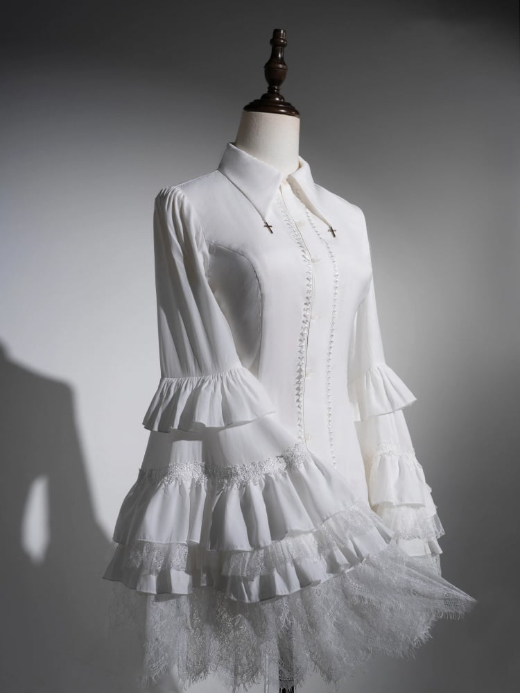 Weißes Gothic Lolita-Hemd mit Glockenärmeln und Kreuzanhänger und spitzem Kragen