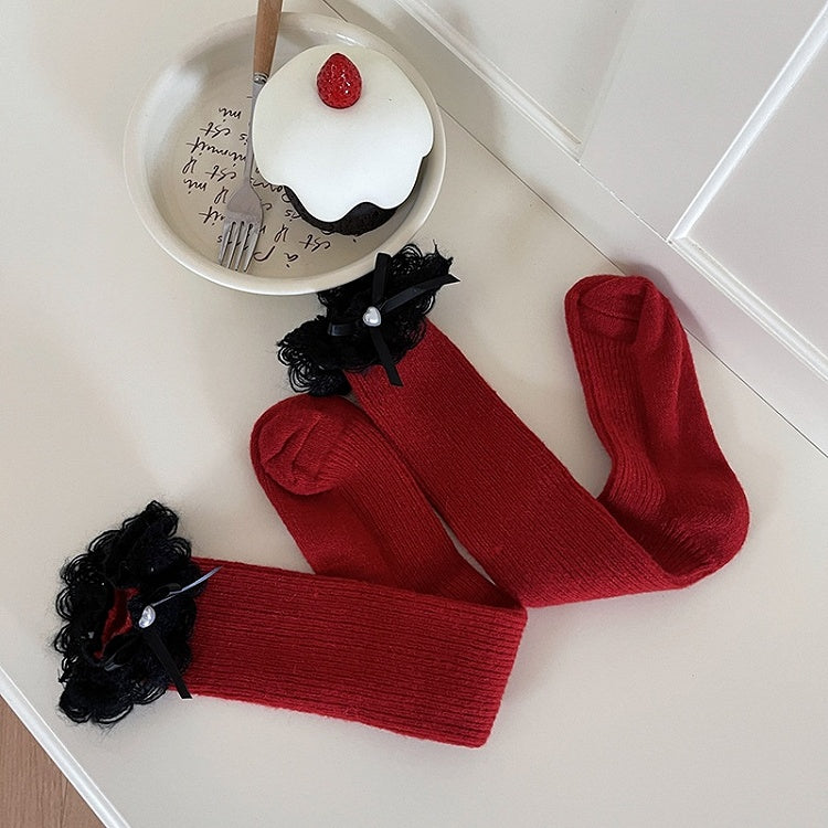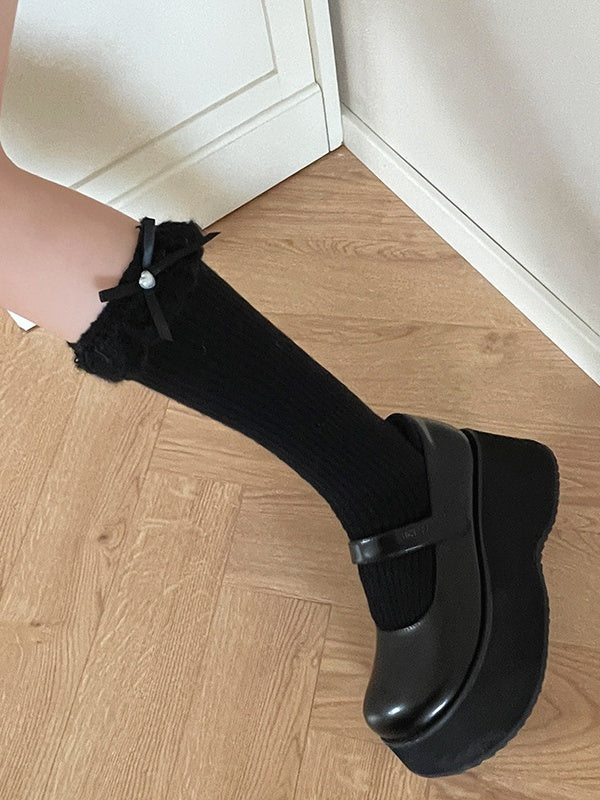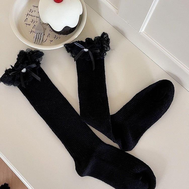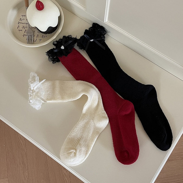 Weiße Lolita Wadensocken mit Schleife und Spitzenbündchen