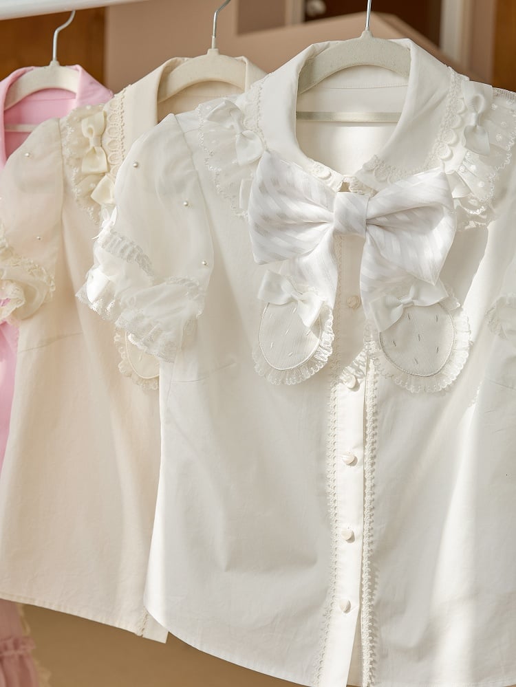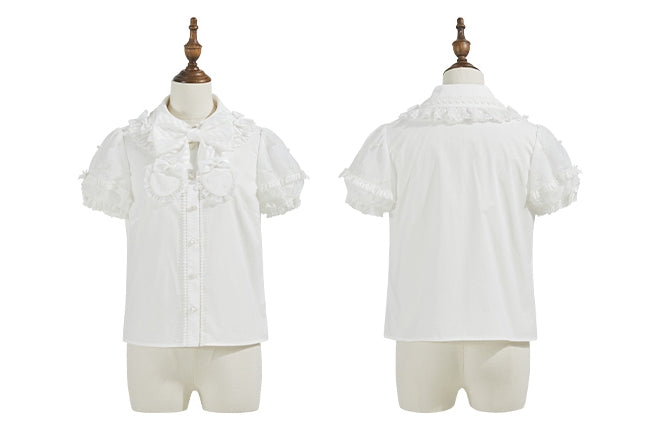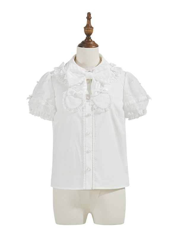 Weiße Bluse mit abnehmbarem Schleifenausschnitt, Perlen und kurzen Puffärmeln