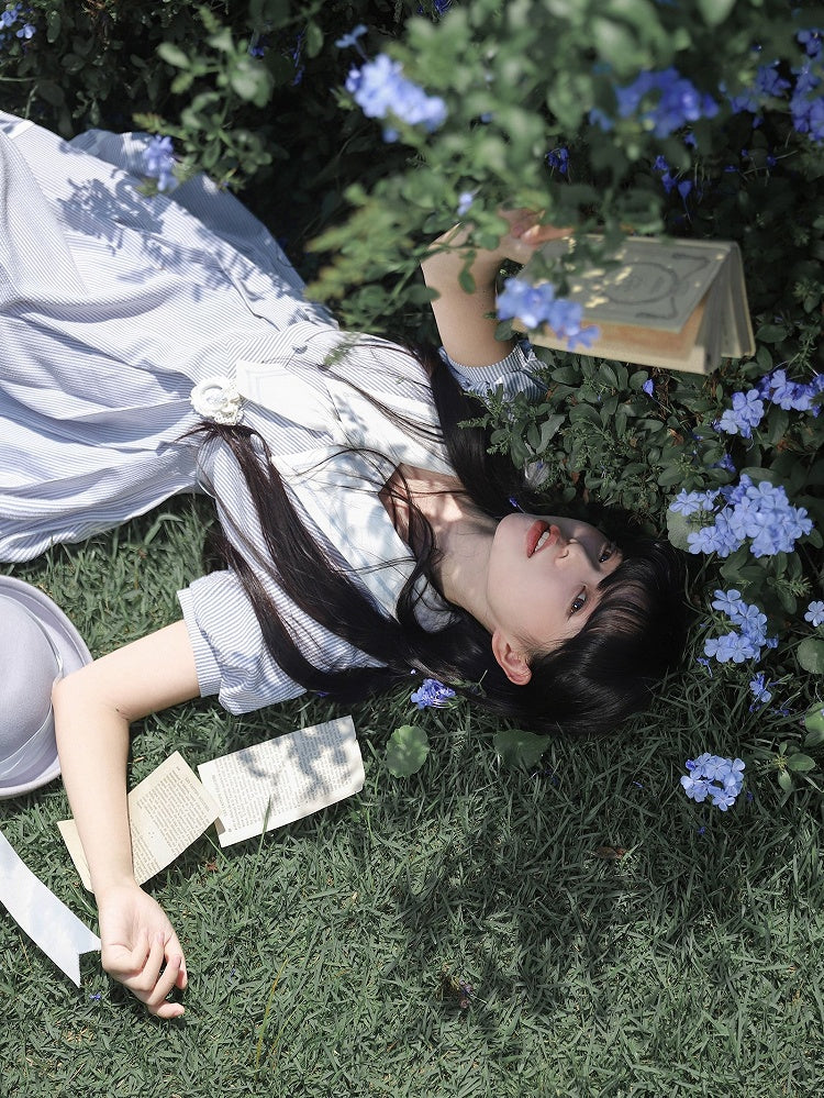 Blau-weißes Old School Lolita Fashion Kleid mit Schleife und Details, JSK-Set
