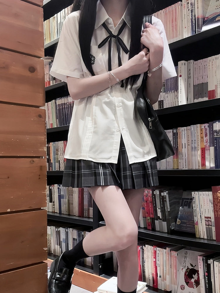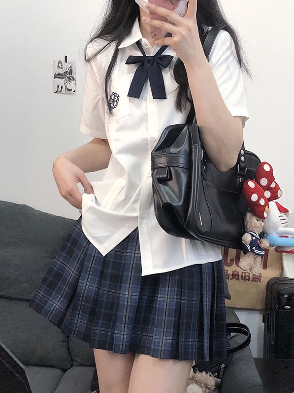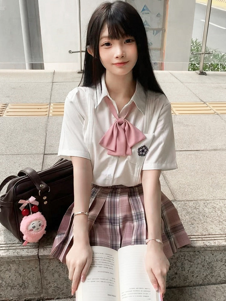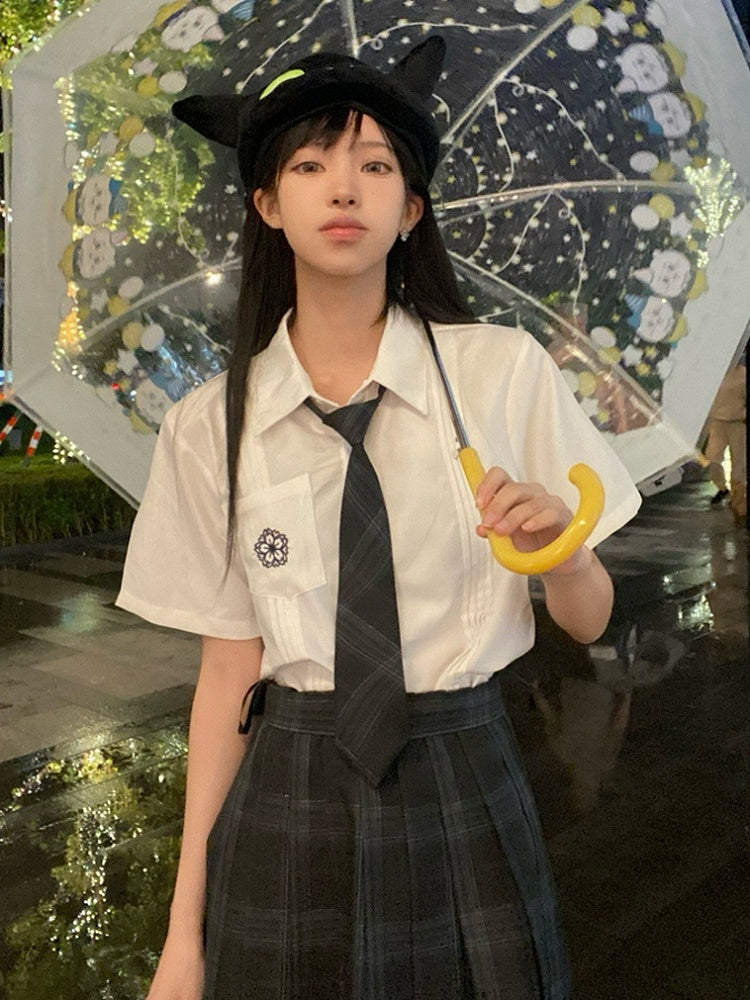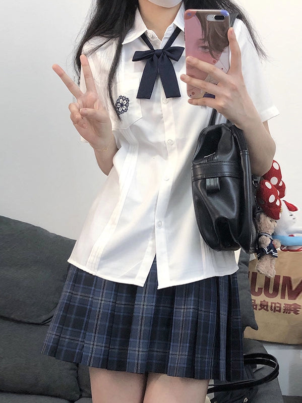Weißes kurzärmliges Hemd im Preppy-Stil mit Blumenstickerei und Faltendetails für die JK-Uniform