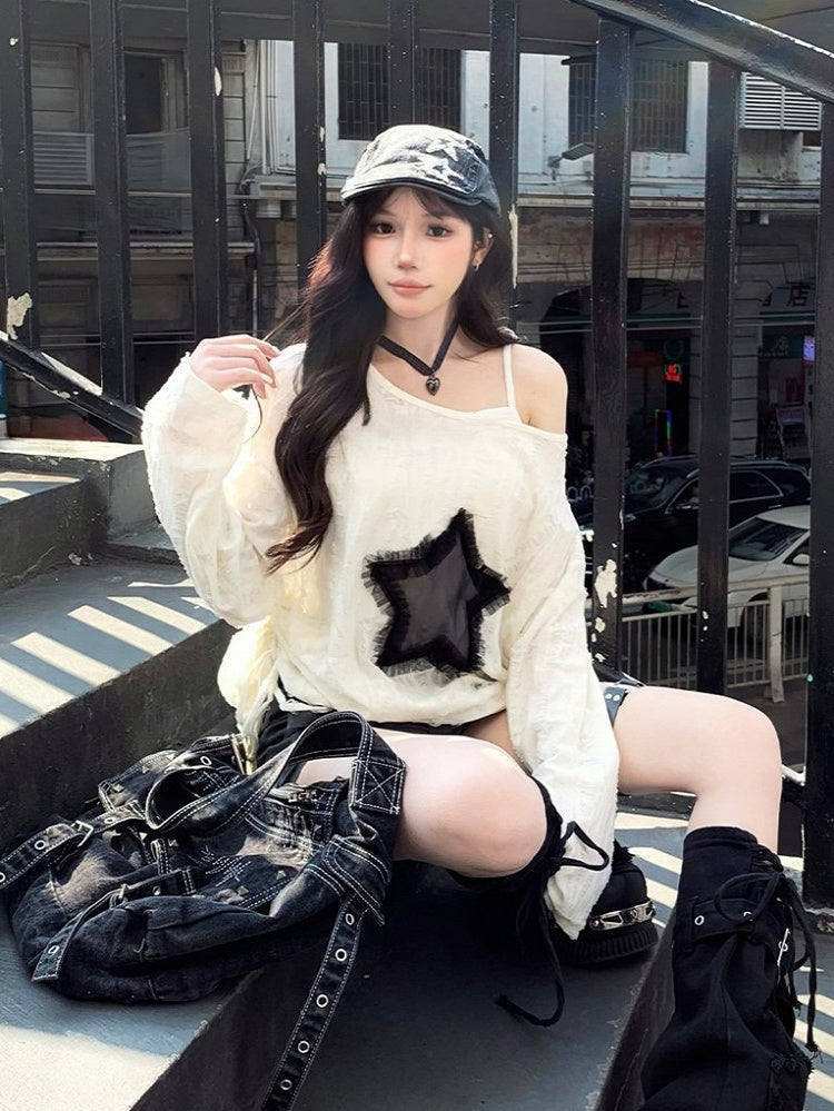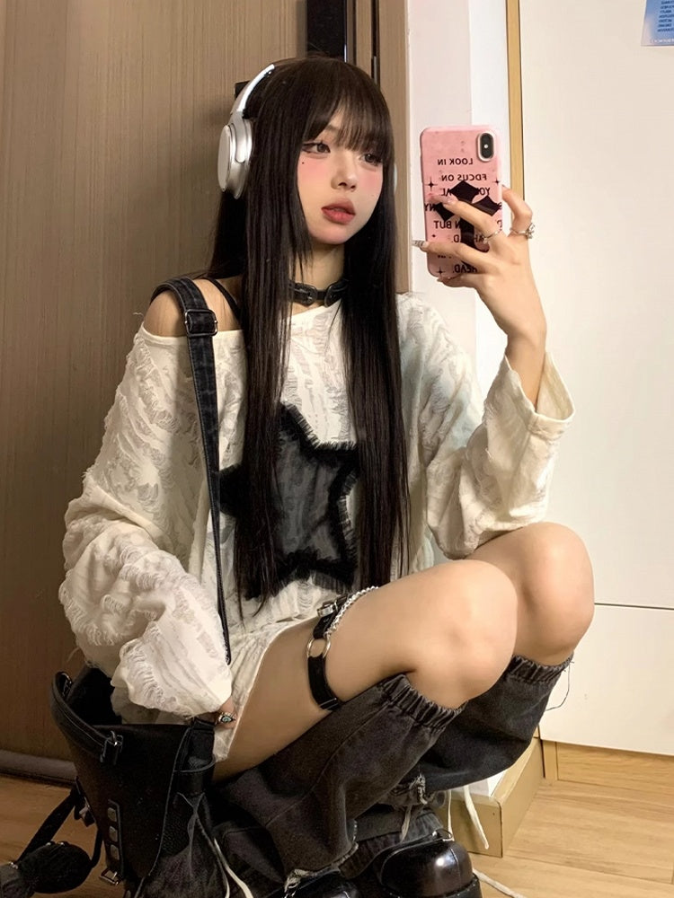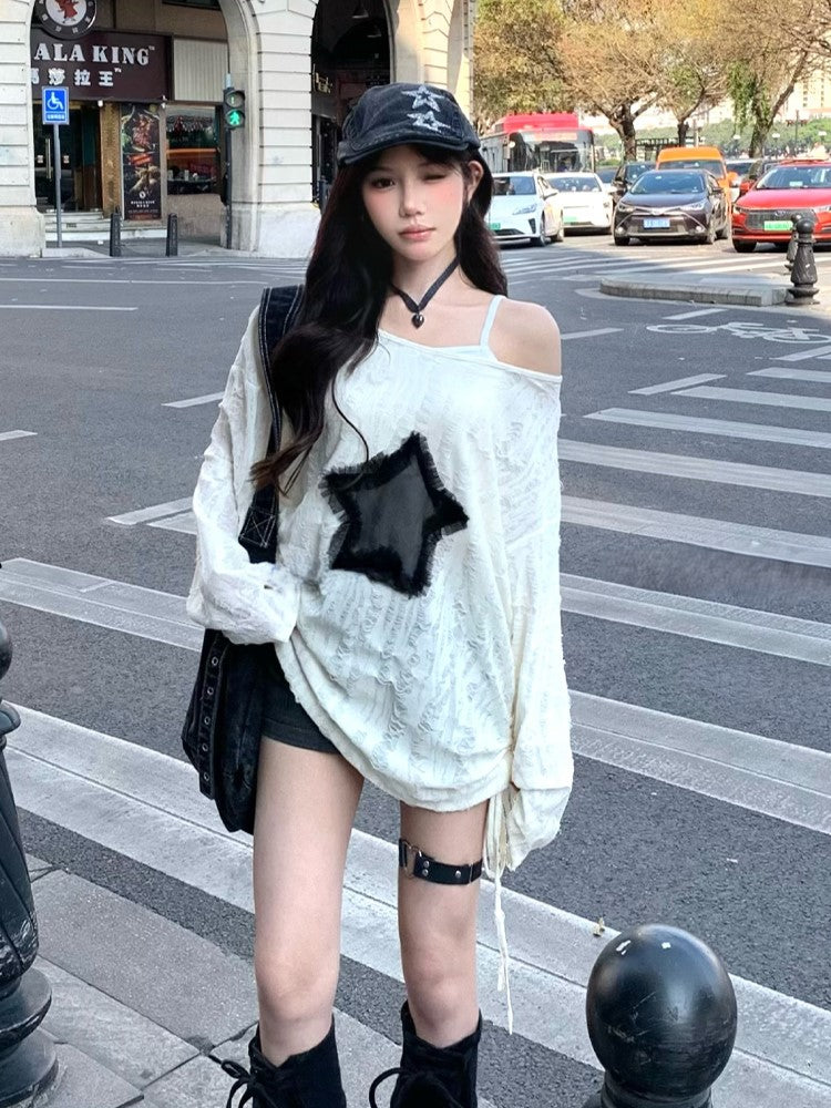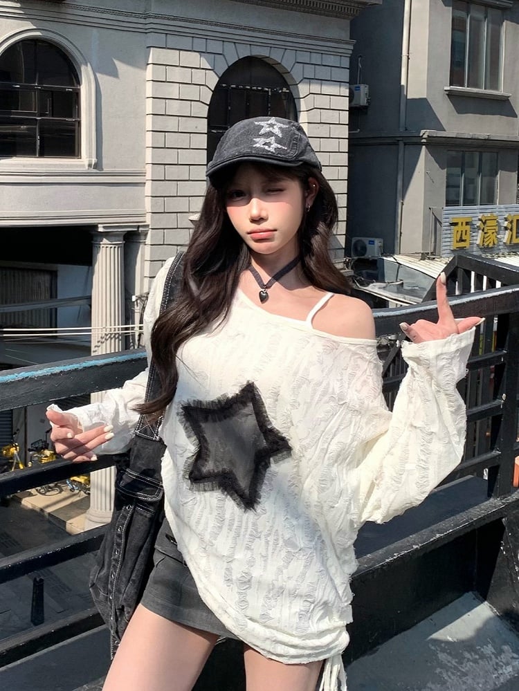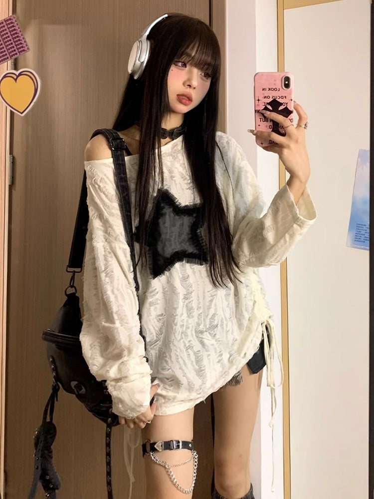 White with Graphic Detail Hole Hem Top Off-Shoulder Tie Star Distressed