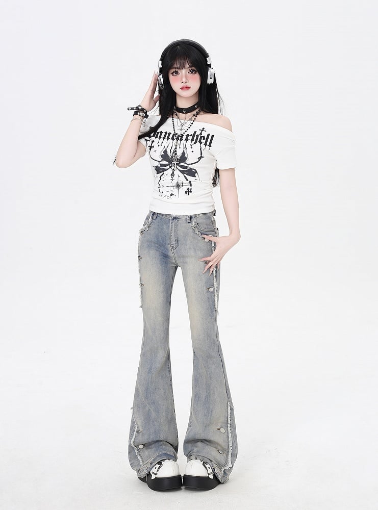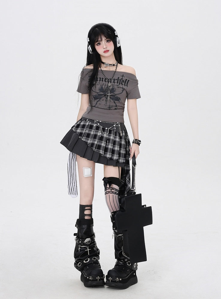Glamouröses T-Shirt mit schulterfreiem Schmetterlingsprint in Weiß/Grau