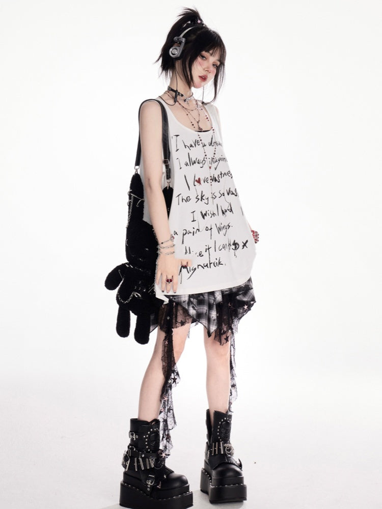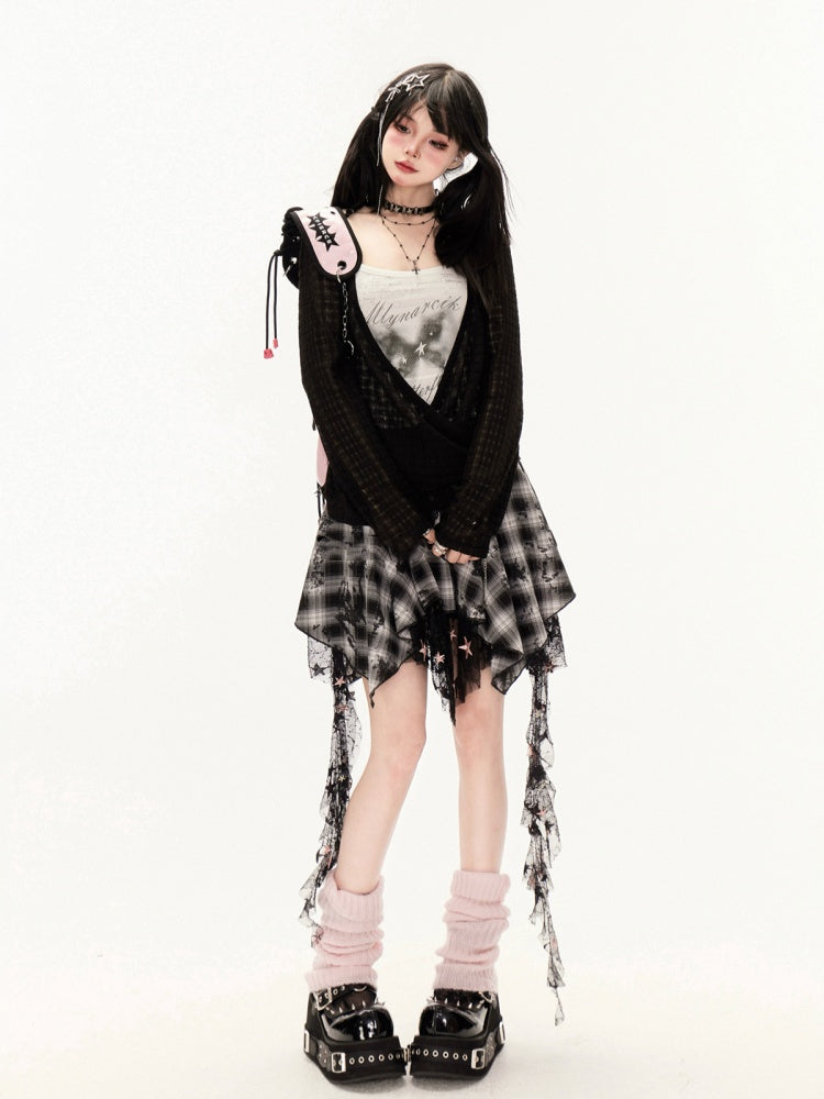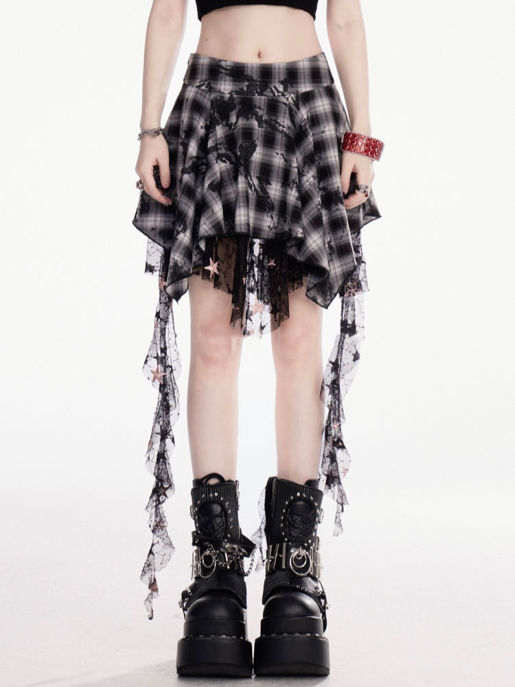 Y2K Schwarz-Weiß Karierter Taschentuch Saum Kaskadierender Rüschen Netzrock