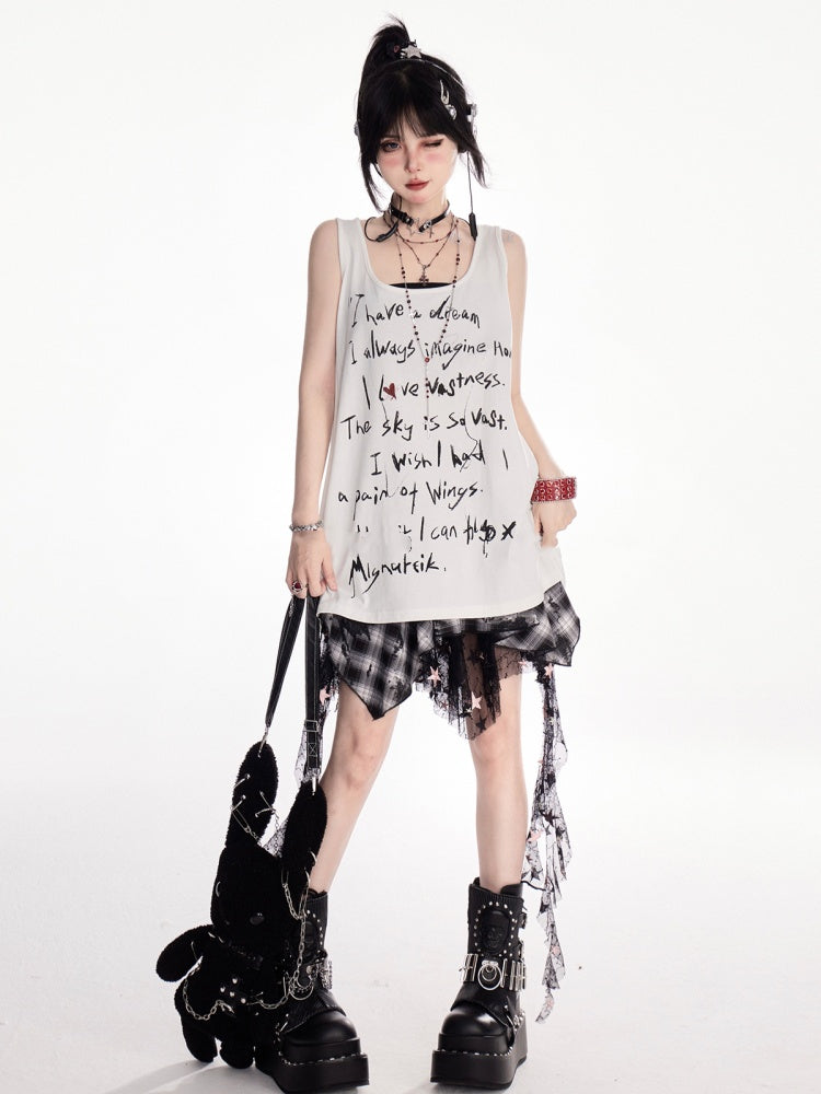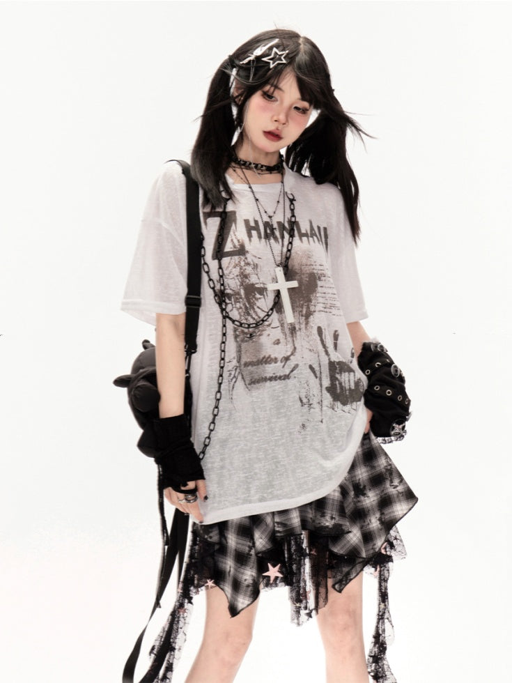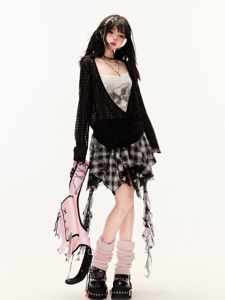 Y2K Schwarz-Weiß Kariertes Taschentuch Saum Kaskadierende Rüschen Mesh