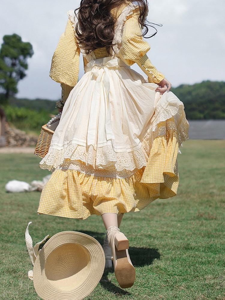 Gelb kariertes, einteiliges Lolita-Kleid mit Bischofsärmeln und hoher Taille