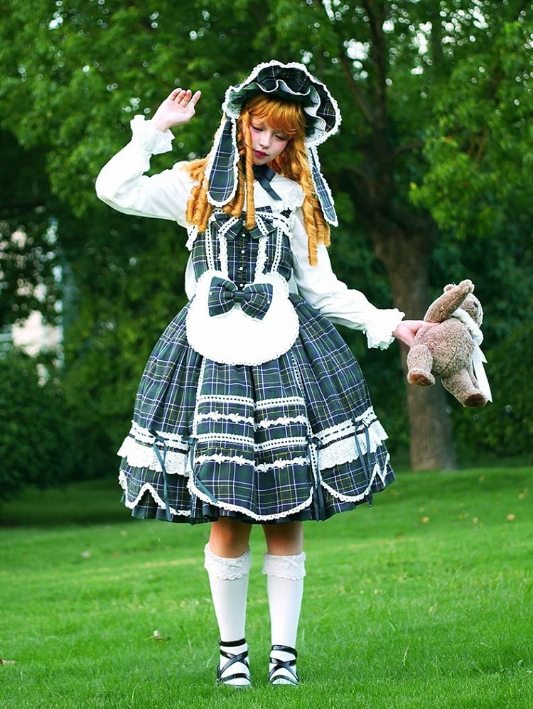 Green Plaid Scalloped Edge Trim Sweet Lolita Jumper Skirt with Bow Accents