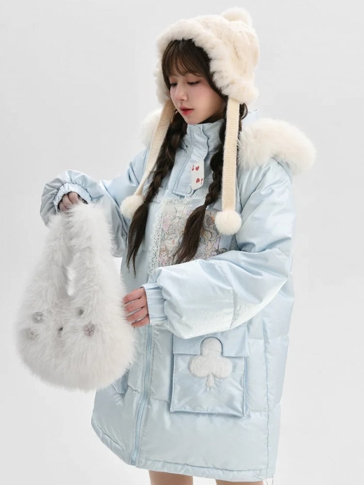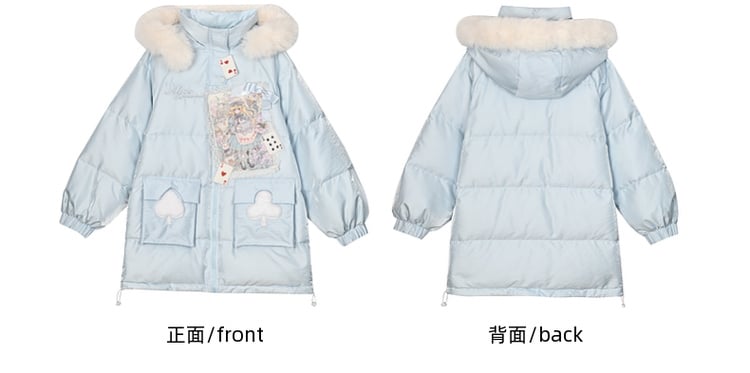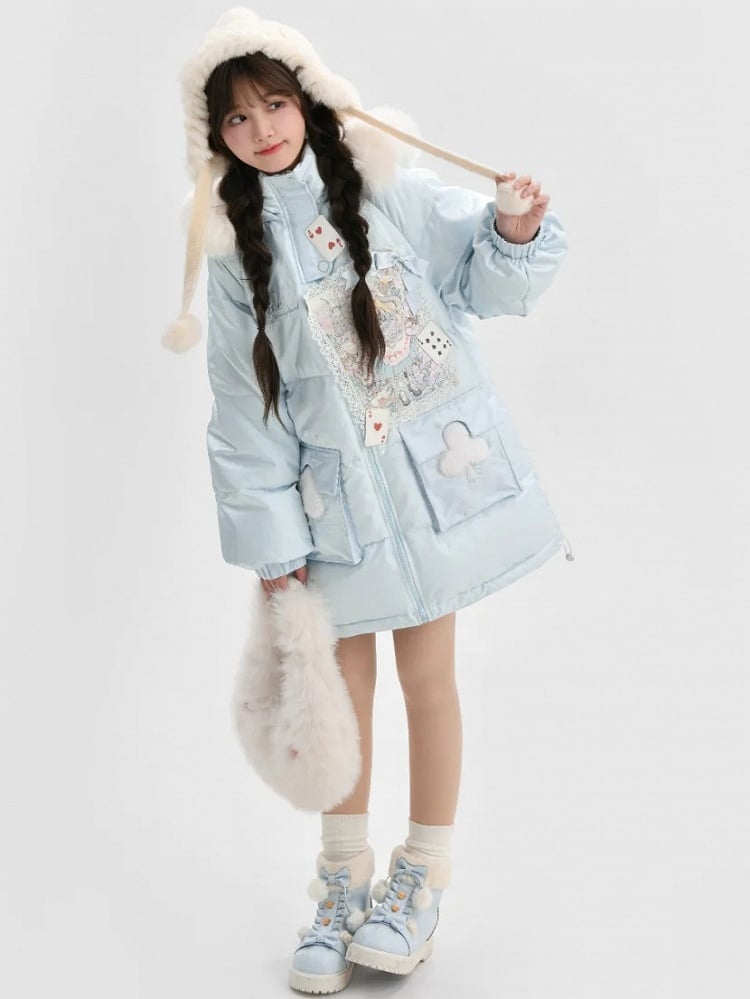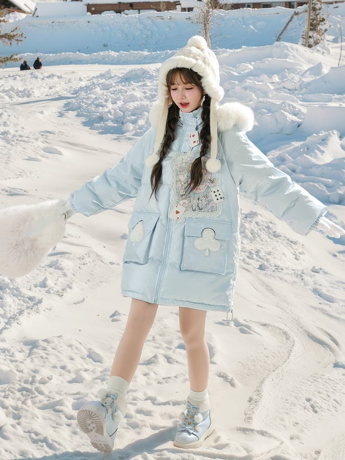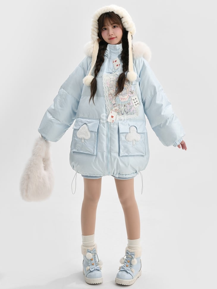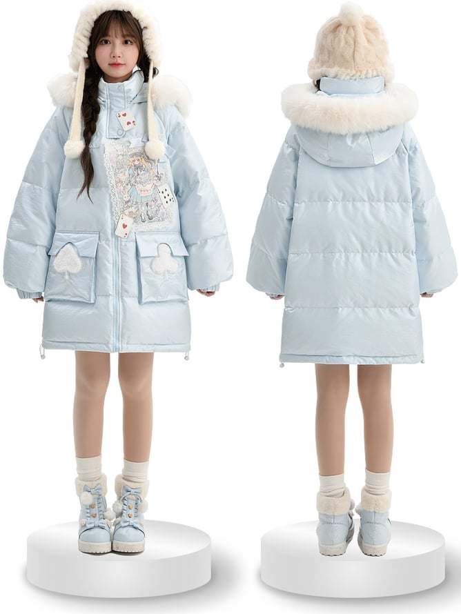 アップリケブルーのフード付きダウンコートで、暖かくキュートな着心地をキープ。ユニークなアップリケデザインと温かみのあるフード付きシルエットが特徴のこのコートは、冬の間ずっとスタイリッシュで快適な着心地をキープします。