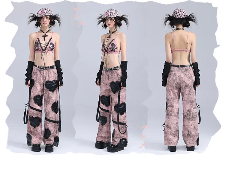 ブラックハートアップリケ ピンク ゴシックパンク ワイドレッグ ジーンズ ジップ付き