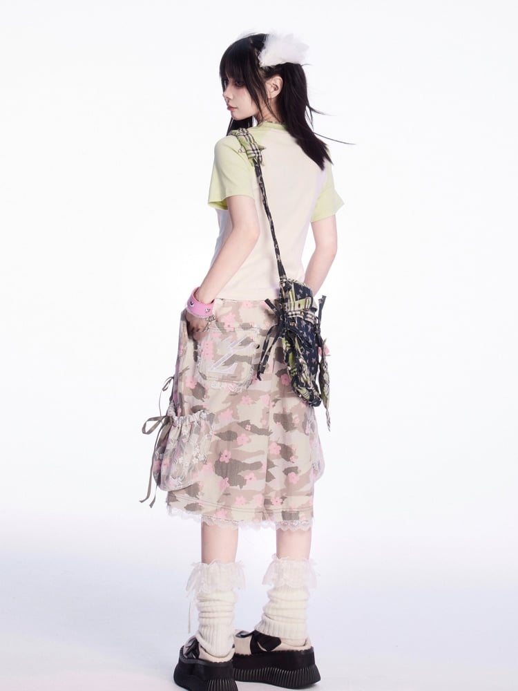 アプリコットとグリーンのカラーブロックデザイン Y2K 漫画プリント T シャツ