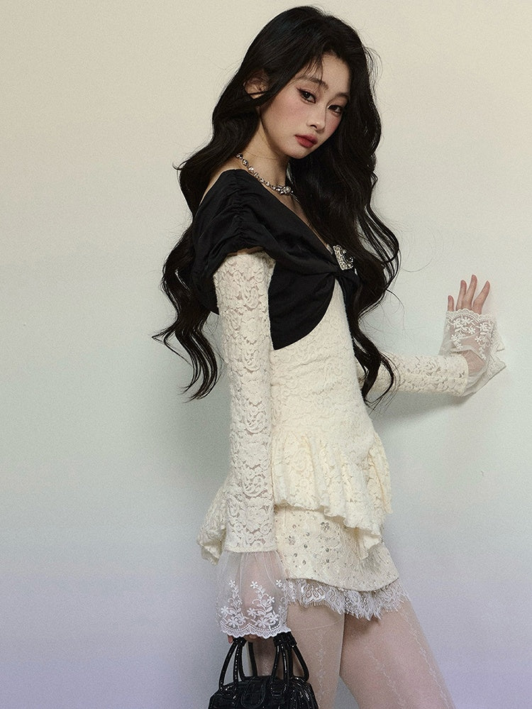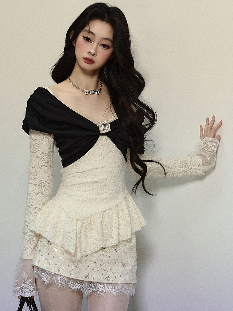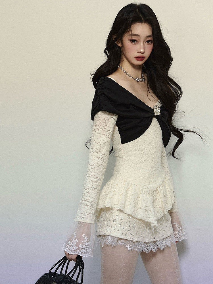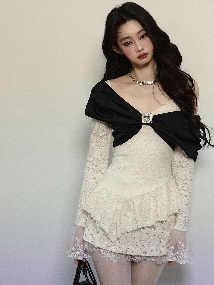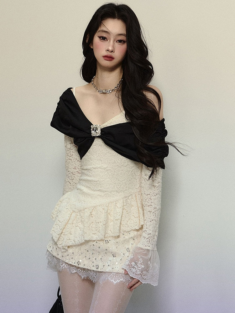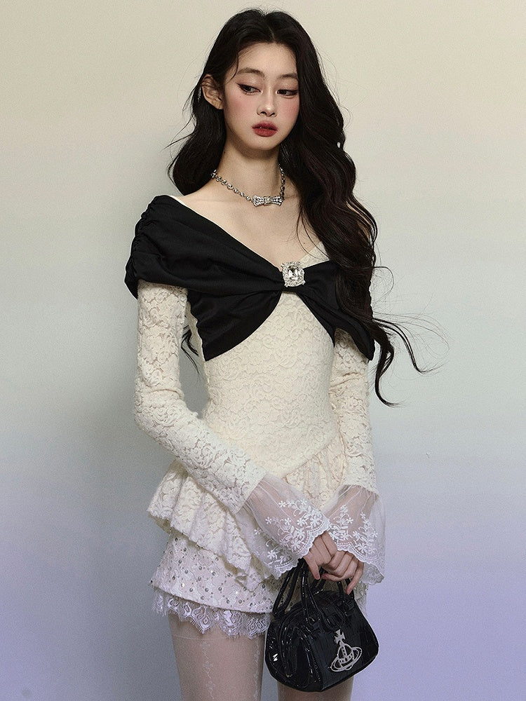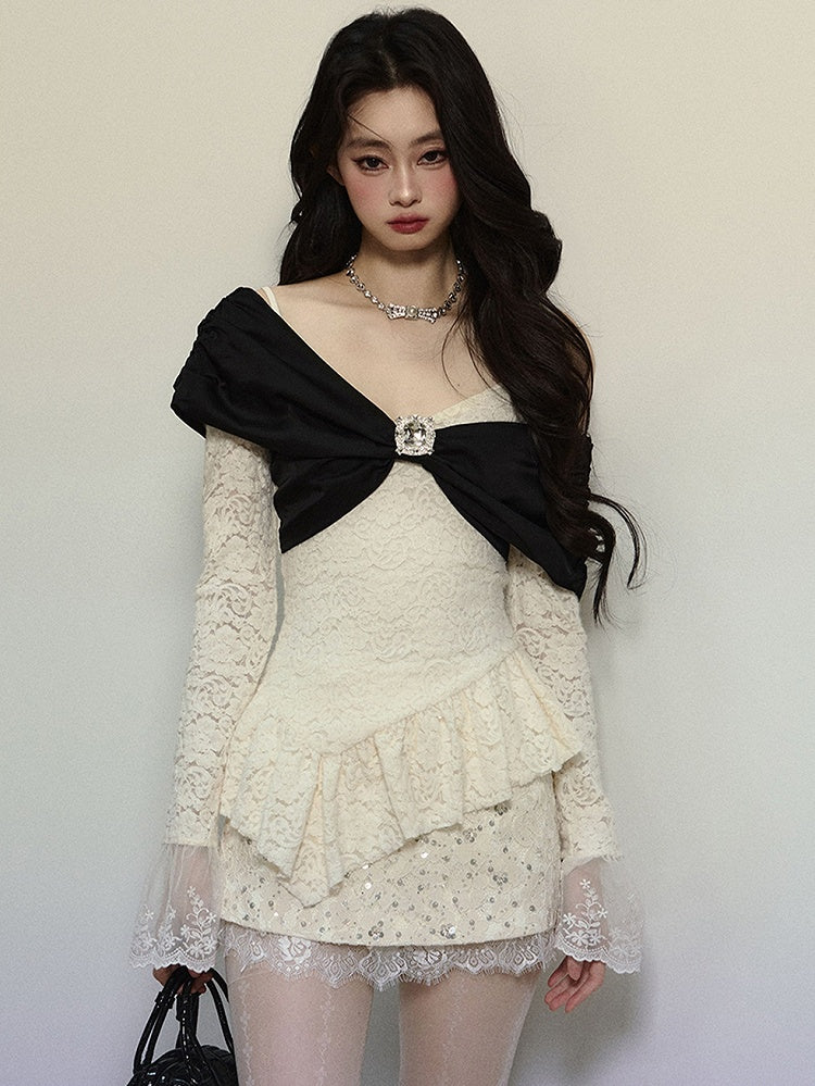 大きなリボンとアシンメトリーな裾が特徴のキュートなトップス。Vネックと長袖が愛らしさを演出します。レースがエレガントな雰囲気を添え、どんなシーンにもぴったりです。