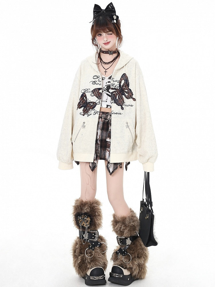 アプリコットバタフライアップリケ春ルーズジップパーカー