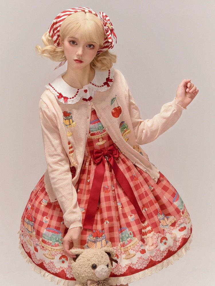 アプリコットの長袖デザートプリントカーディガンで、心地よくキュートな着こなしを。愛らしいデザートプリントが特徴のこのカーディガンは、どんなコーディネートにも甘さをプラスしてくれます。長袖なので、一年を通して暖かくスタイリッシュに過ごせます。