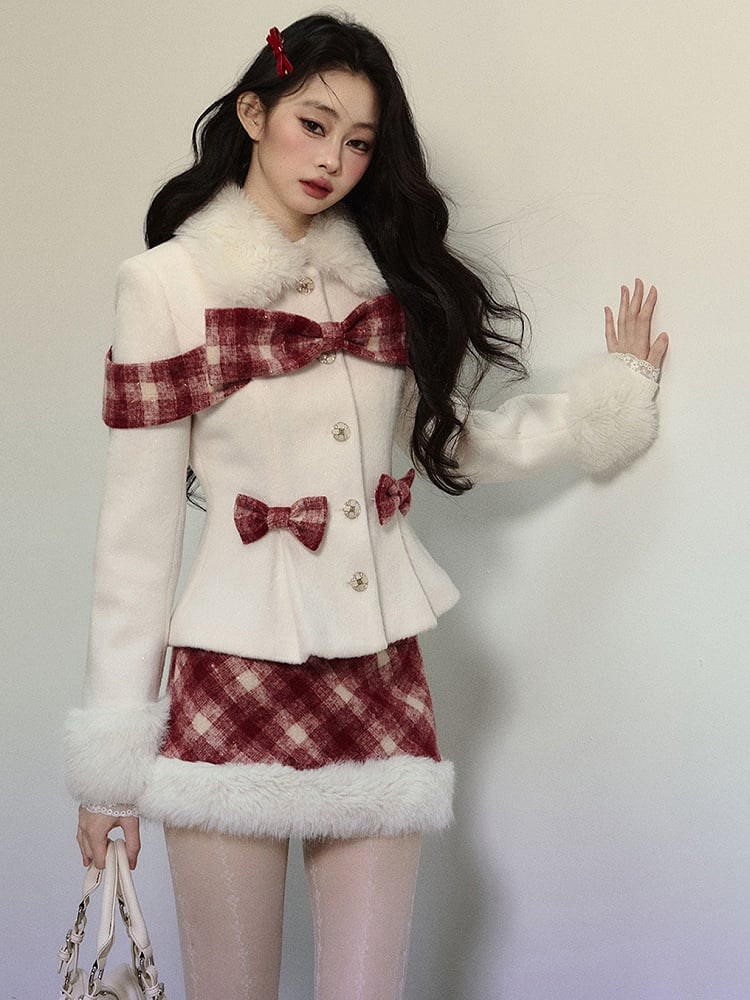 アプリコットチェックのウールジャケットは、キュートなリボンがアクセントになり、素敵な雰囲気を演出します。ワードローブにプラスして、暖かくスタイリッシュに過ごしましょう。
