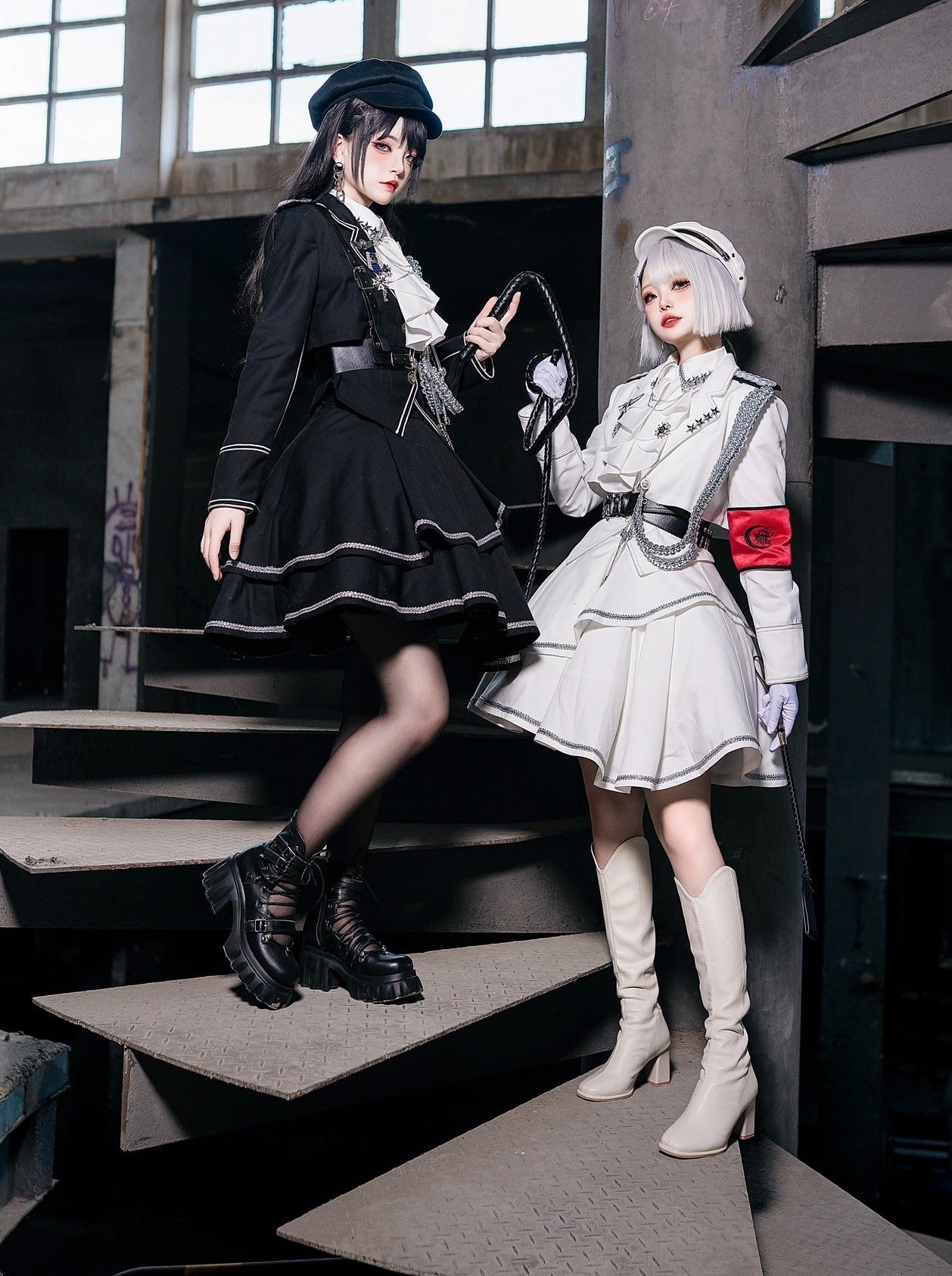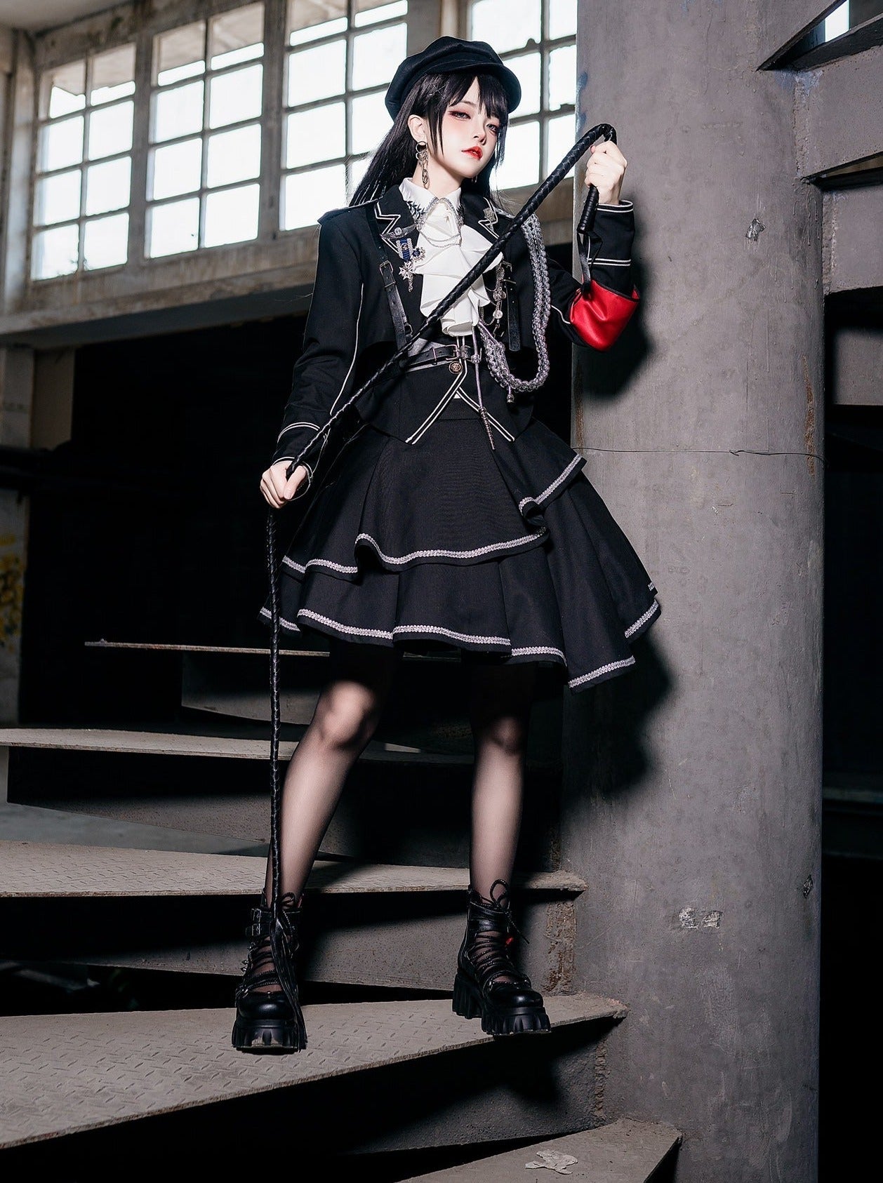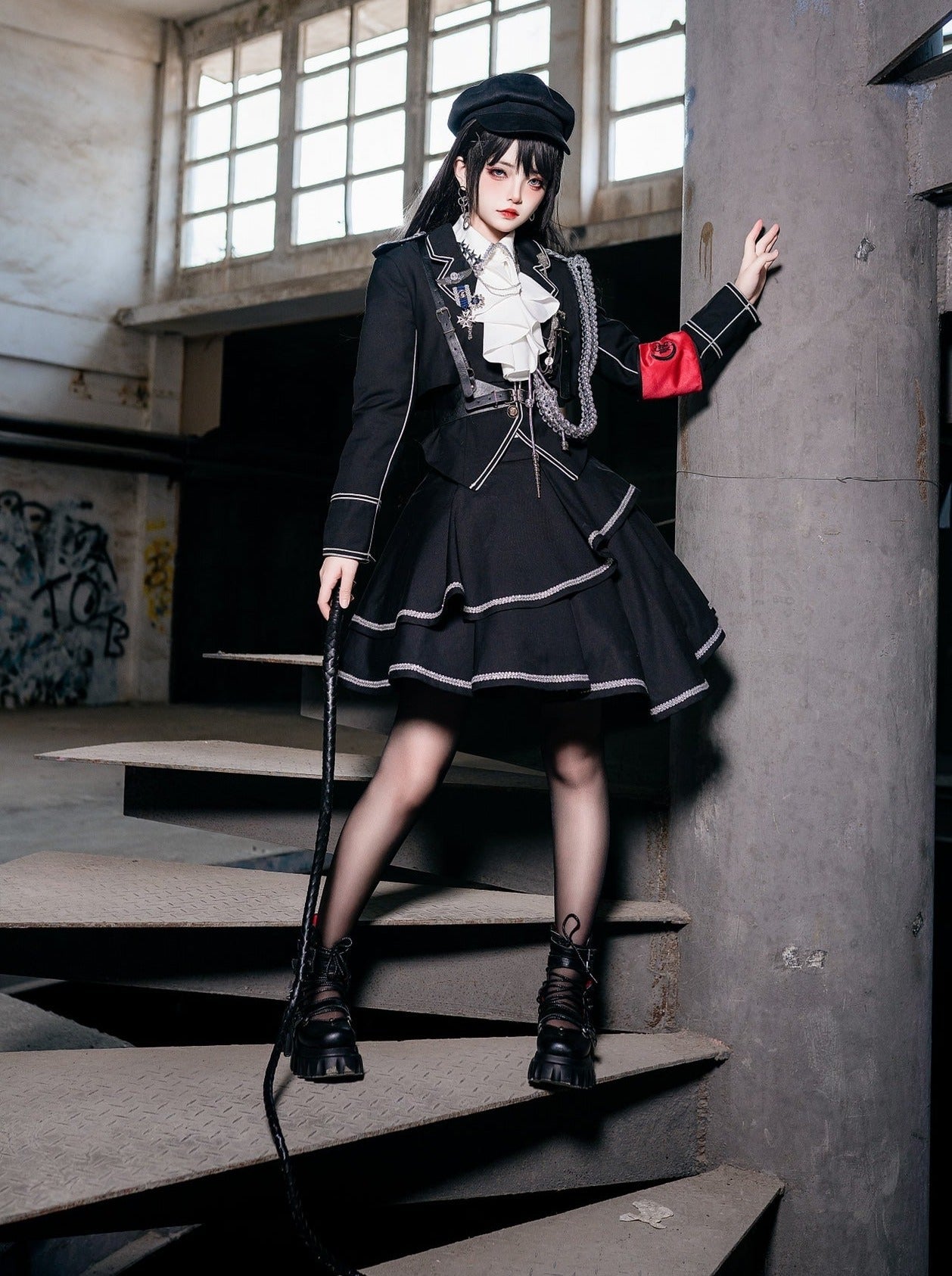 アーミースカートダークでファッション界を制覇する準備は万端!このアシンメトリーなミリタリースカートは、ユニフォームシャツとマントと完璧にマッチし、キュートで自信に満ちたルックを演出します。この愛らしいアンサンブルで、あなたのスタイルと力強さをアピールしましょう。