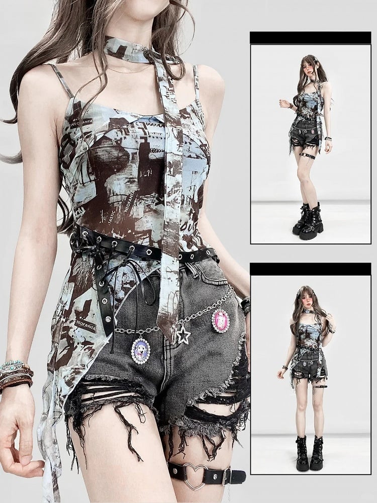 ブルーのビタースイートなレースアップディテール、アシンメトリーヘムのキャミソールトップス+スカーフ