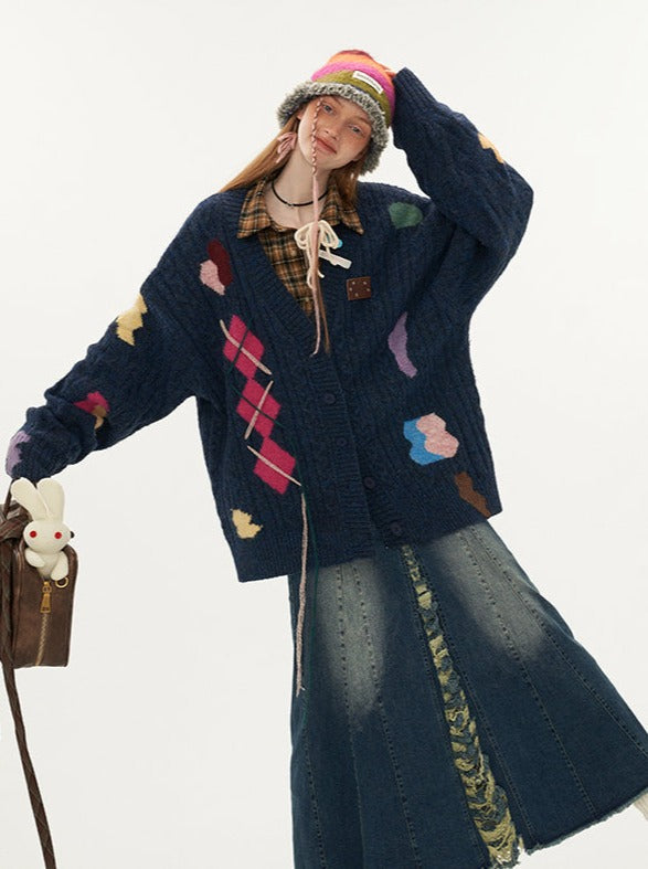 アシンメトリーニットオーバーデザインカーディガンレトロカラフル