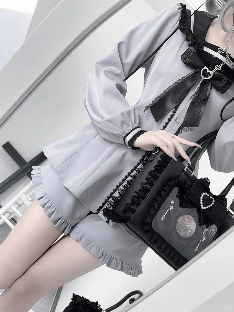 ダスティパープルのジライケイセット - セーラーカラーのバニー耳デザインバックミニドレス + フリルヘムショーツ + 蝶ネクタイ